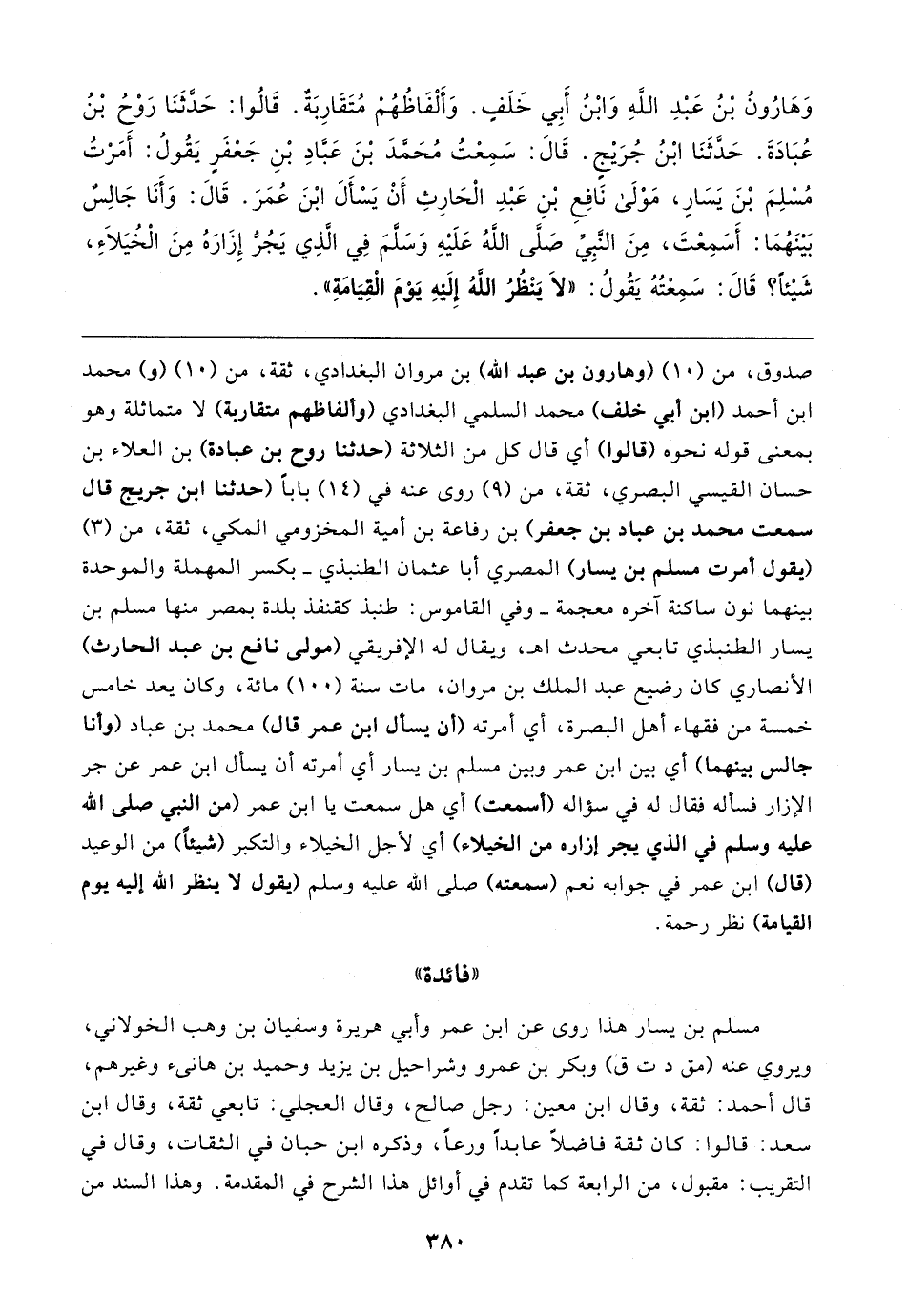 وَهَارُونُ بْنُ عَبْدِ اللهِ وَابْنُ أَبِي خَلَفٍ. وَأَلْفَاظُهُمْ مُتَقَارِبَةٌ. قَالُوا: حَدَّثَنَا رَوْحُ بْنُ عُبَادَةَ. حَدَّثَنَا ابْنُ جُرَيجٍ. قَال: سَمِعْتُ مُحَمَّدَ بْنَ عَبَّادِ بْنِ جَعْفَرٍ يَقُولُ: أَمَرْتُ مُسْلِمَ بْنَ يَسَارٍ، مَوْلَى نَافِعِ بْنِ عَبْدِ الْحَارِثِ أَنْ يَسْأَلَ ابْنَ عُمَرَ. قَال: وَأَنَا جَالِسٌ بَينَهُمَا: أَسَمِعْتَ، مِنَ النَّبِيِّ صَلَّى اللهُ عَلَيهِ وَسَلَّمَ في الَّذِي يَجُرُّ إِزَارَهُ مِنَ الْخُيَلاءِ، شَيئًا؟ قَال: سَمِعْتُهُ يَقُولُ: "لَا يَنْظُرُ اللهُ إِلَيهِ يَوْمَ الْقِيَامَةِ"