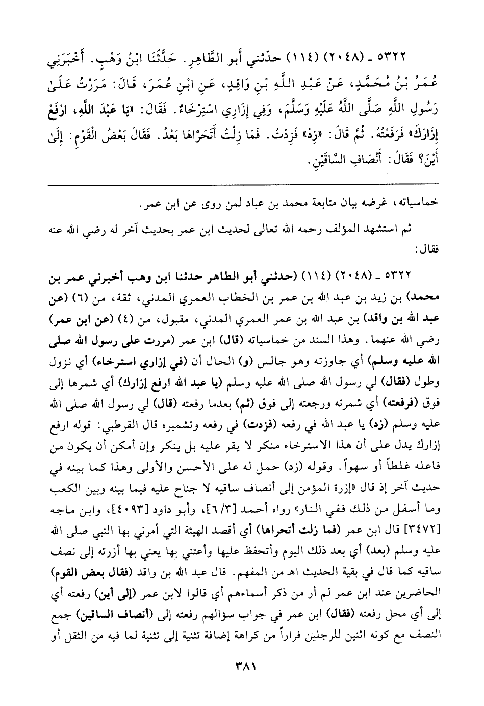 ٥٣٢٢ - (٢٠٤٨) (١١٤) حدّثني أَبو الطَّاهِرِ. حَدَّثَنَا ابْنُ وَهْبٍ. أَخْبَرَنِي عُمَرُ بْنُ مُحَمَّدٍ، عَنْ عَبْدِ اللَّهِ بْنِ وَاقِدٍ، عَنِ ابْنِ عُمَرَ، قَال: مَرَرْتُ عَلَى رَسُولِ اللهِ صَلَّى اللهُ عَلَيهِ وَسَلَّمَ، وَفِي إِزَارِي اسْتِرْخَاءٌ. فَقَال: "يَا عَبْدَ اللهِ، ارْفَعْ إِزَارَكَ" فَرَفَعْتُهُ. ثُمَّ قَال: "زِدْ" فَزِدْتُ. فمَا زِلْتُ أَتَحَرَّاهَا بَعْدُ. فَقَال بَعْضُ الْقَوْمِ: إِلَى أَينَ؟ فَقَال: أَنْصَافِ السَّاقَينِ