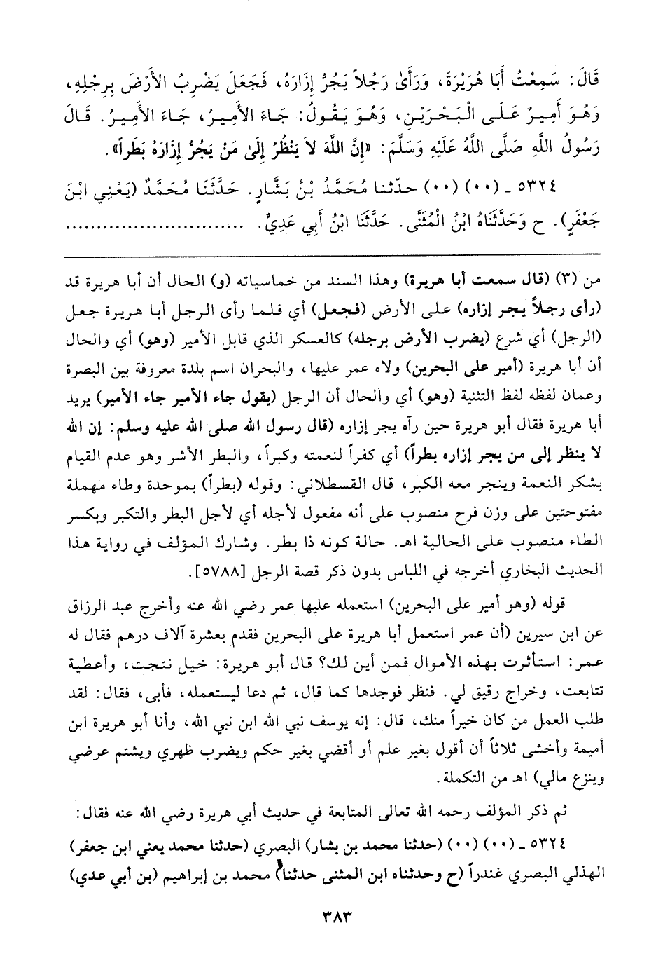 من (٣) (قال سمعت أبا هريرة) وهذا السند من خماسياته (و) الحال أن أبا هريرة قد (رأى رجلًا يجر إزاره) على الأرض (فجعل) أي فلما رأى الرجل أبا هريرة جعل (الرجل) أي شرع (يضرب الأرض برجله) كالعسكر الذي قابل الأمير (وهو) أي والحال أن أبا هريرة (أمير على البحرين) ولاه عمر عليها، والبحران اسم بلدة معروفة بين البصرة وعمان لفظه لفظ التثنية (وهو) أي والحال أن الرجل (يقول جاء الأمير جاء الأمير) يريد أبا هريرة فقال أبو هريرة حين رآه يجر إزاره (قال رسول الله صلى الله عليه وسلم: إن الله لا ينظر إلى من يجر إزاره بطرًا) أي كفرًا لنعمته وكبرًا، والبطر الأشر وهو عدم القيام بشكر النعمة وينجر معه الكبر، قال القسطلاني: وقوله (بطرًا) بموحدة وطاء مهملة مفتوحتين على وزن فرح منصوب على أنه مفعول لأجله أي لأجل البطر والتكبر وبكسر الطاء منصوب على الحالية اهـ. حالة كونه ذا بطر. وشارك المؤلف في رواية هذا الحديث البخاري أخرجه في اللباس بدون ذكر قصة الرجل [٥٧٨٨].