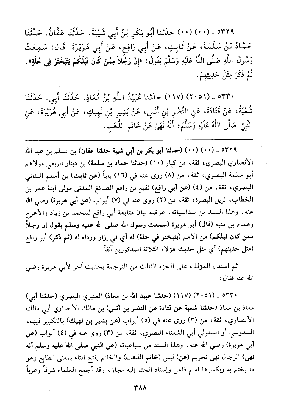 ٥٣٢٩ - (٠٠) (٠٠) حدَّثنا أَبُو بَكْرِ بْنُ أَبِي شَيبَةَ. حَدَّثَنَا عَفَّانُ. حَدَّثَنَا حَمَّادُ بْنُ سَلَمَةَ، عَنْ ثَابِتٍ، عَنْ أبِي رَافِعٍ، عَنْ أَبِي هُرَيرَةَ. قَال: سَمِعْتُ رَسُولَ اللهِ صَلَّى اللهُ عَلَيهِ وَسَلَّمَ يَقُولُ: "إِنَّ رَجُلًا مِمَّنْ كَانَ قَبلَكُمْ يَتَبَخْتَرُ فِي حُلَّةٍ".