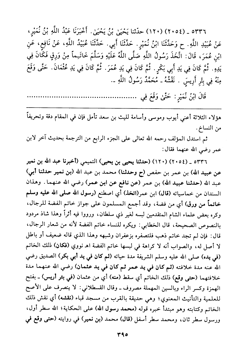 ٥٣٣٦ - (٢٠٥٤) (١٢٠) حدَّثنا يَحْيَى بْنُ يَحْيَى. أَخْبَرَنَا عَبْدُ اللهِ بْنُ نُمَيرٍ، عَنْ عُبَيدِ اللهِ. ح وَحَدَّثَنَا ابْنُ نُمَيرٍ. حَدَّثَنَا أَبِي. حَدَّثَنَا عُبَيدُ اللهِ، عَنْ نَافِعٍ، عَنِ ابْنِ عُمَرَ، قَال: اتَّخَذَ رَسُولُ اللهِ صَلَّى اللهُ عَلَيهِ وَسَلَّمَ خَاتَمًا مِنْ وَرِقٍ فَكَانَ فِي يَدِهِ. ثُمَّ كَانَ فِي يَدِ أَبِي بَكْرٍ. ثُمَّ كَانَ فِي يَدِ عُمَرَ. ثُمَّ كَانَ فِي يَدِ عُثْمَانَ. حَتَّى وَقَعَ مِنْهُ فِي بِئْرِ أَرِيسٍ. نَقْشُهُ - مُحَمَّدٌ رَسُولُ اللهِ -.
