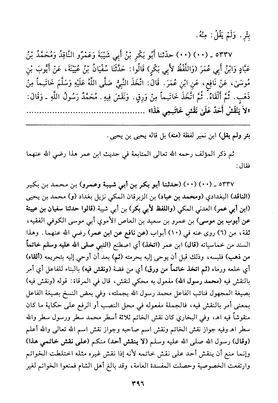 ٥٣٣٧ - (٠٠) (٠٠) حدَّثنا أَبُو بَكْرِ بْنُ أَبِي شَيبَةَ وَعَمْرٌو النَّاقِدُ وَمُحَمَّدُ بْنُ عَبَّادٍ وَابْنُ أَبِي عُمَرَ (وَاللَّفْظُ لأبِي بَكْرٍ) قَالُوا: حَدَّثنَا سُفْيَانُ بْنُ عُيَينَةَ، عَنْ أَيُّوبَ بْنِ مُوسَى، عَن نَافِعٍ، عَنِ ابْنِ عُمَرَ. قَال: اتَخَذَ النَّبِيُّ صَلَّى اللهُ عَلَيهِ وَسَلَّمَ خَاتِمًا مِنْ ذَهَبٍ. ثُمَّ أَلْقَاهُ. ثُمَّ اتَّخَذَ خَاتَمًا مِنْ وَرِقٍ. وَنَقَشَ فِيهِ. مُحَمَّدٌ رَسُولُ اللهِ- وَقَال: "لَا يَنْقُشْ أَحَدٌ عَلَى نَقْشِ خَاتَمِي هذَا"