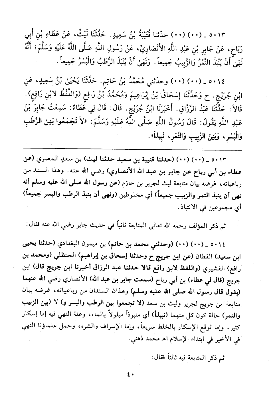 ٥٠١٣ - (٠٠) (٠٠) حدَّثنا قُتَيبَةُ بْنُ سَعِيدٍ. حَدَّثَنَا لَيثٌ، عَنْ عَطَاءِ بْنِ أَبِي رَبَاحٍ، عَنْ جَابِرِ بْنِ عَبْدِ الله الأنْصَارِيِّ، عَنْ رَسُولِ اللهِ صَلى اللهُ عَلَيهِ وسلَّمَ؛ أَنَّهُ نَهَى أَنْ يُنْبَذَ التَمْرُ وَالزبِيبُ جَمِيعًا. وَنَهَى أنْ يُنْبَذَ الرُّطَبُ وَالبُسْرُ جَمِيعًا.