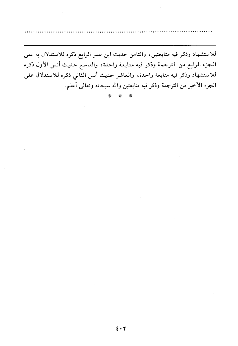 للاستشهاد وذكر فيه متابعتين، والثامن حديث ابن عمر الرابع ذكره للاستدلال به على الجزء الرابع من الترجمة وذكر فيه متابعة واحدة، والتاسع حديث أنس الأول ذكره للاستشهاد وذكر فيه متابعة واحدة، والعاشر حديث أنس الثاني ذكره للاستدلال على الجزء الأخير من الترجمة وذكر فيه متابعتين والله سبحانه وتعالى أعلم.