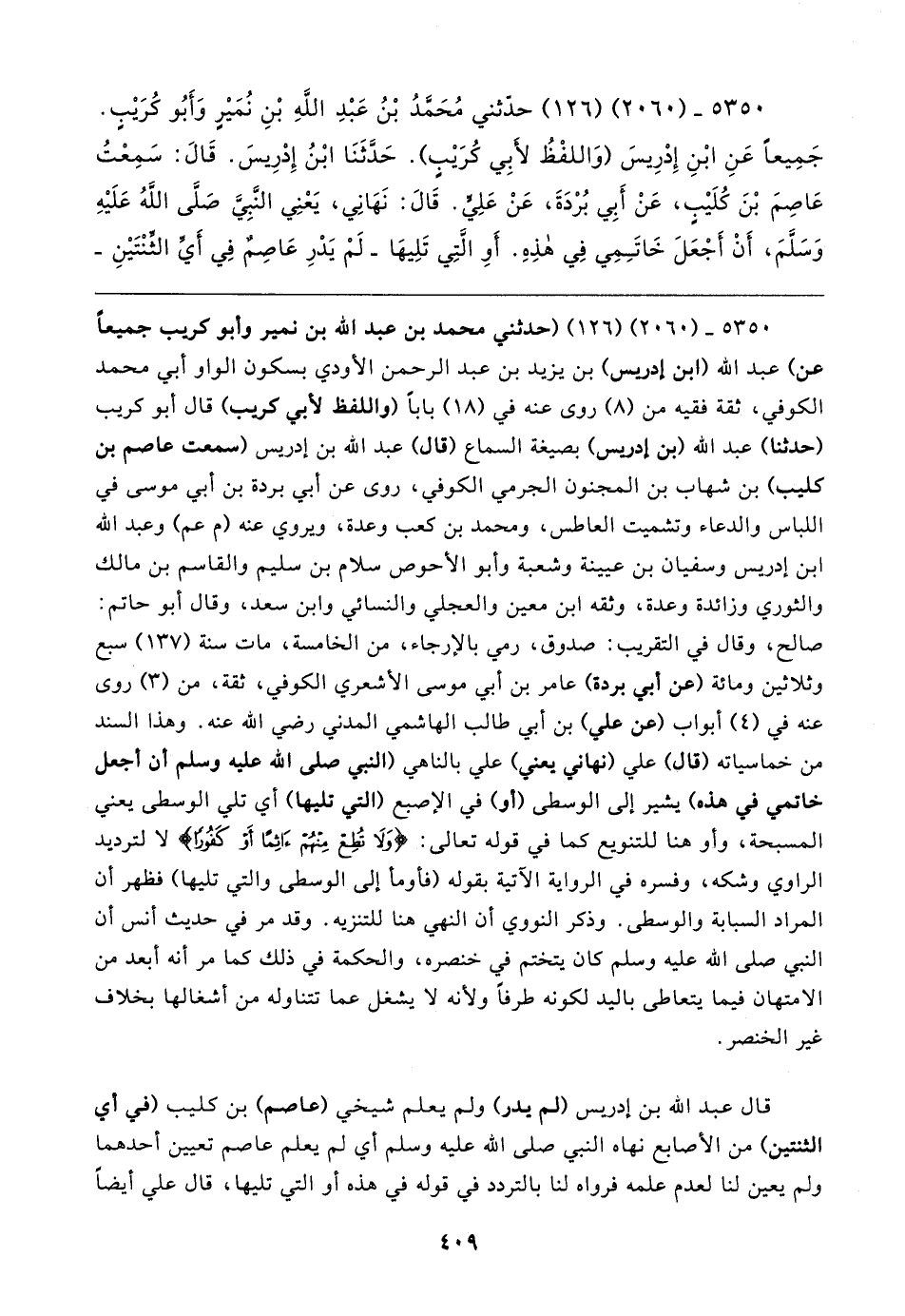٥٣٥٠ - (٢٠٦٠) (١٢٦) حدّثني مُحَمَّدُ بْنُ عَبْدِ اللهِ بْنِ نُمَيرٍ وَأَبُو كُرَيبٍ. جَمِيعًا عَنِ ابْنِ إِدْرِيسَ (وَاللفْظُ لأبِي كُرَيبٍ). حَدَّثَنَا ابْنُ إِدْرِيسَ. قَال: سَمِعْتُ عَاصِمَ بْنَ كُلَيبٍ، عَنْ أَبِي بُرْدَةَ، عَنْ عَلِيٍّ. قَال: نَهَانِي، يَعْنِي النَّبِيَّ صَلَّى اللهُ عَلَيهِ وَسَلَّمَ، أَنْ أَجْعَلَ خَاتَمِي فِي هذِهِ. أَو الَّتِي تَلِيهَا - لَمْ يَدْرِ عَاصِمٌ فِي أَيِّ الثِّنْتَينِ -