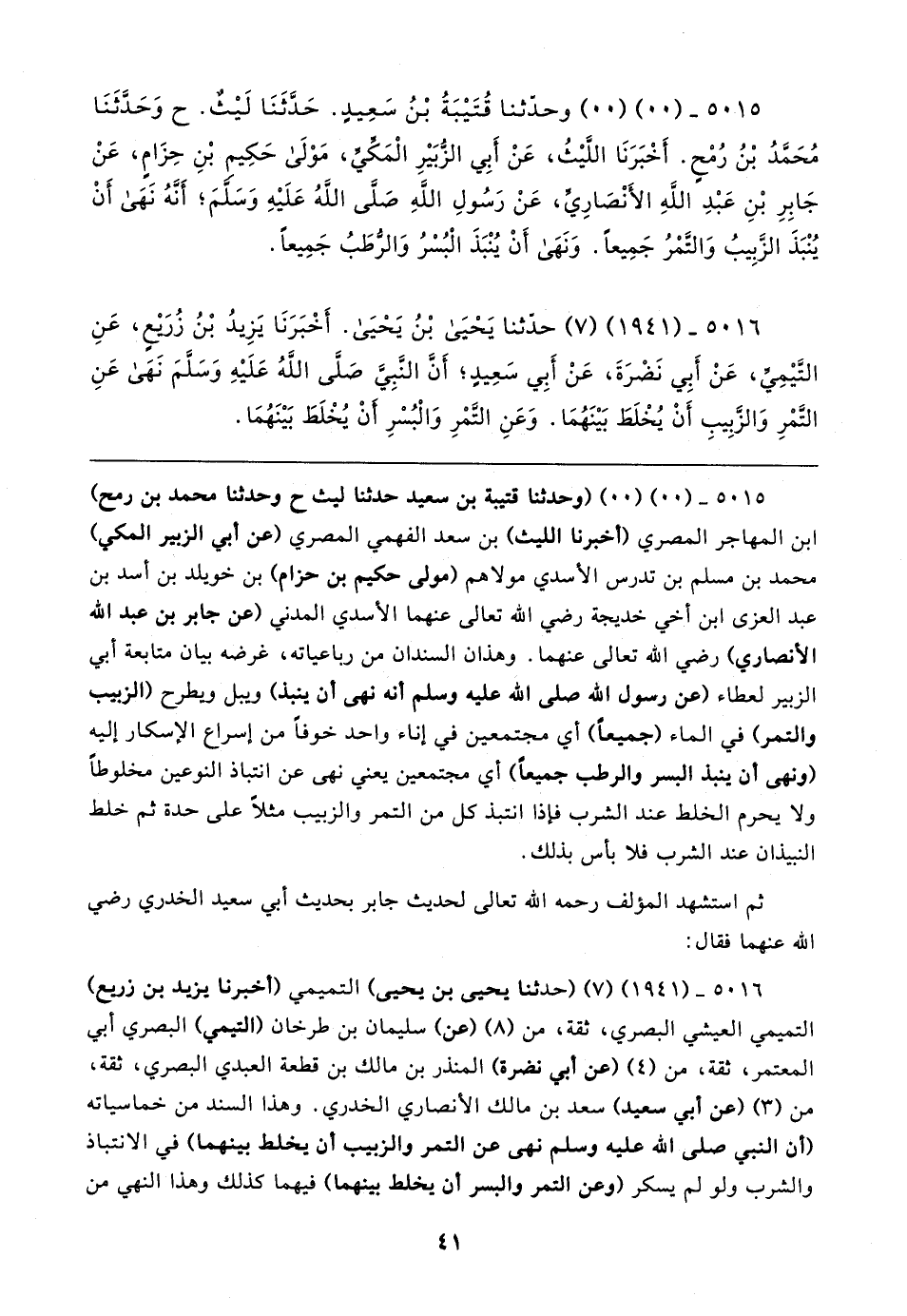 ٥٠١٦ - (١٩٤١) (٧) (حدثنا يحيى بن يحيى) التَّمِيمِيّ (أخبرنا يزيد بن زريع) التَّمِيمِيّ العيشي البَصْرِيّ، ثِقَة، من (٨) (عن) سليمان بن طرخان (التَّيميّ) البَصْرِيّ أبي المعتمر، ثِقَة، من (٤) (عن أبي نضرة) المنذر بن مالك بن قطعة العبدي البَصْرِيّ، ثِقَة، من (٣) (عن أبي سعيد) سعد بن مالك الأَنْصَارِيّ الخُدرِيّ. وهذا السند من خماسياته (أن النَّبِيّ صلى الله عليه وسلم نهى عن التمر والزبيب أن يخلط بينهما) في الانتباذ والشرب ولو لم يسكر (وعن التمر والبسر أن يخلط بينهما) فيهما كذلك وهذا النهي من