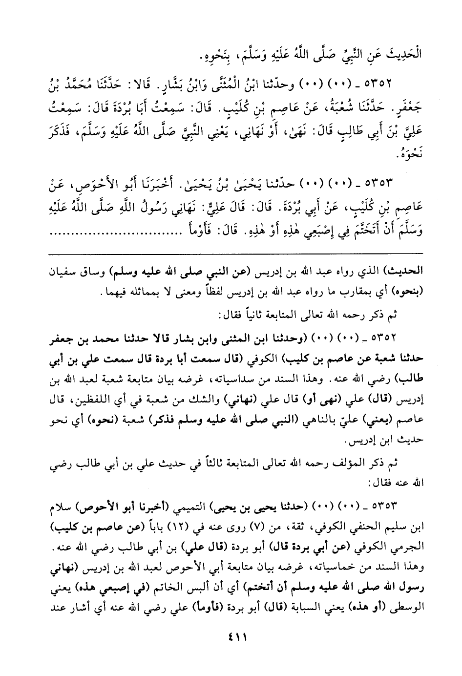 ٥٣٥٢ - (٠٠) (٠٠) (وحدثنا ابن المثنى وابن بشار قالا حدثنا محمد بن جعفر حدثنا شعبة عن عاصم بن كليب) الكوفي (قال سمعت أبا بردة قال سمعت علي بن أبي طالب) رضي الله عنه. وهذا السند من سداسياته، غرضه بيان متابعة شعبة لعبد الله بن إدريس (قال) علي (نهى أو) قال علي (نهاني) والشك من شعبة في أي اللفظين، قال عاصم (يعني) على بالناهي (النبي صلى الله عليه وسلم فذكر) شعبة (نحوه) أي نحو حديث ابن إدريس.