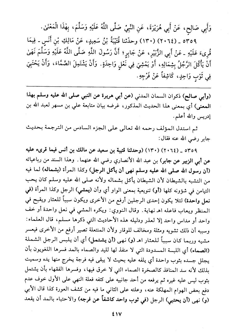٥٣٥٩ - (٢٠٦٤) (١٣٠) (وحدثنا قتيبة بن سعيد عن مالك بن أنس فيما قرئ عليه عن أبي الزبير عن جابر) بن عبد الله الأنصاري رضي الله عنهما. وهذا السند من رباعياته (أن رسول الله صلى الله عليه وسلم نهى أن يأكل الرجل) وكذا المرأة (بشماله) لما فيه من التشبه بالشيطان لأن الشيطان يأكل بشماله ولأنه صلى الله عليه وسلم كان يحب التيامن في شؤونه كلها (أو) تنويعية بمعنى الواو أي وأن (يمشي) الرجل وكذا المرأة (في نعل واحدة) لئلا يكون إحدى الرجلين أرفع من الأخرى ويكون سببًا للعثار ويقبح في المنظر ويعاب فاعله اهـ نهاية. وقال النووي: ويكره المشي في نعل واحدة أو خف واحد أو مداس واحد إلا لعذر ودليله هذه الأحاديث التي ذكرها مسلم، قال العلماء: وسببه أن ذلك تشويه ومثلة ومخالف للوقار ولأن المنتعلة تصير أرفع من الأخرى فيعسر مشيه وربما كان سببًا للعثار اهـ (و) نهى (أن يشتمل) أي أن يلبس الرجل الشملة (الصماء) أي اللبسة المسدودة التي لا منفذ لها لليد والصماء بالمد فسرها اللغويون بأن يجلل جسده بثوب واحدة أي يلفه عليه بحيث لا يبقى فيه فرجة يخرج منها يده وسميت بذلك لأنه سد المنافذ كالصخرة الصماء التي لا خرق فيها، وفسرها الفقهاء بأن يشتمل بثوب ليس عليه غيره ثم يرفعه من أحد جانبيه على كتفه فعلة النهي على الأول خوف عدم دفع بعض الهوام المهلكة عنه، وعلته على الثاني ما فيه من كشف العورة كذا قال الأبي (و) نهى (أن يحتبي) الرجل (في ثوب واحد كاشفًا عن فرجه) والاحتباء بالمد أن يقعد