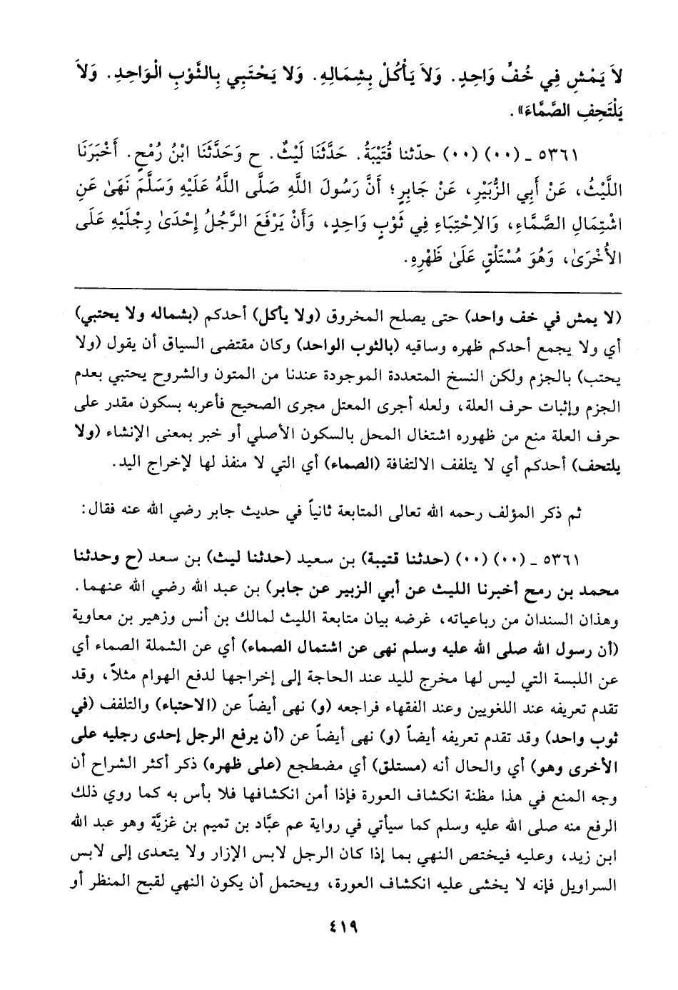 (لا يمش في خف واحد) حتى يصلح المخروق (ولا يأكل) أحدكم (بشماله ولا يحتبي) أي ولا يجمع أحدكم ظهره وساقيه (بالثوب الواحد) وكان مقتضى السياق أن يقول (ولا يحتب) بالجزم ولكن النسخ المتعددة الموجودة عندنا من المتون والشروح يحتبي بعدم الجزم وإثبات حرف العلة، ولعله أجرى المعتل مجرى الصحيح فأعربه بسكون مقدر على حرف العلة منع من ظهوره اشتغال المحل بالسكون الأصلي أو خبر بمعنى الإنشاء (ولا يلتحف) أحدكم أي لا يتلفف الالتفافة (الصماء) أي التي لا منفذ لها لإخراج اليد.