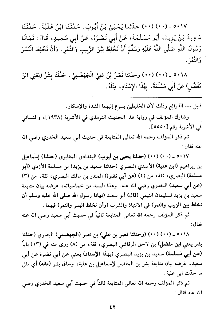 ٥٠١٧ - (٠٠) (٠٠) (حدثنا يحيى بن أَيُّوب) البغدادي المقابري (حَدَّثَنَا) إسماعيل بن إبراهيم (ابن عليّة) الأسدي البَصْرِيّ (حَدَّثَنَا سعيد بن يزيد) بن مسلمة الأَزدِيّ (أبو مسلمة) البَصْرِيّ، ثِقَة، من (٤) (عن أبي نضرة) المنذر بن مالك البَصْرِيّ، ثِقَة، من (٣) (عن أبي سعيد) الخُدرِيّ رضي الله عنه. وهذا السند من خماسياته، غرضه بيان متابعة سعيد بن يزيد لسليمان التَّيميّ (قال) أبو سعيد (نهانا رسول الله صلى الله عليه وسلم أن نخلط بين الزبيب والتَّمر) في الانتباذ والشرب (وأن نخلط البسر والتَّمر) فيهما.