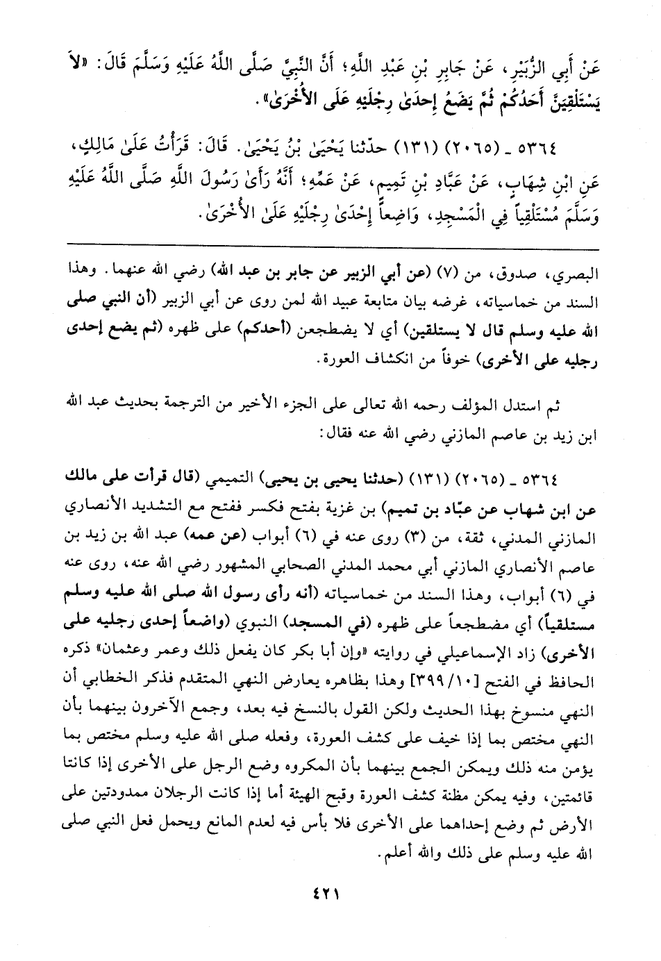عَنْ أبِي الزُّبَيرِ، عَنْ جَابِرِ بْنِ عَبْدِ اللهِ؛ أَنَّ النَّبِيَّ صَلَّى اللهُ عَلَيهِ وَسَلَّمَ قَال: "لَا يَسْتَلْقِيَنَّ أَحَدُكُمْ ثُمَّ يَضَعُ إِحدَى رِجْلَيهِ عَلَى الأُخْرَى".