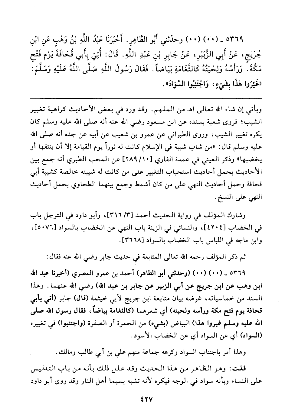 ٥٣٦٩ - (٠٠) (٠٠) وحدَّثني أَبُو الطَّاهِرِ. أَخْبَرَنَا عَبْدُ اللهِ بْنُ وَهْبٍ عَنِ ابْنِ جُرَيجٍ، عَنْ أَبِي الزُّبَيرِ، عَنْ جَابِرِ بْنِ عَبْدِ اللهِ. قَال: أُتِيَ بِأَبي قُحَافَةَ يَوْم فَتْحِ مَكَّةَ. وَرَأسُهُ وَلحْيَتُهُ كَالثَّغَامَةِ بَيَاضًا. فَقَال رَسُولُ اللهِ صَلَّى اللهُ عَلَيهِ وَسَلَّمَ: "غَيِّرُوا هذَا بِشَيءٍ، وَاجْتَنِبُوا السَّوَادَ"