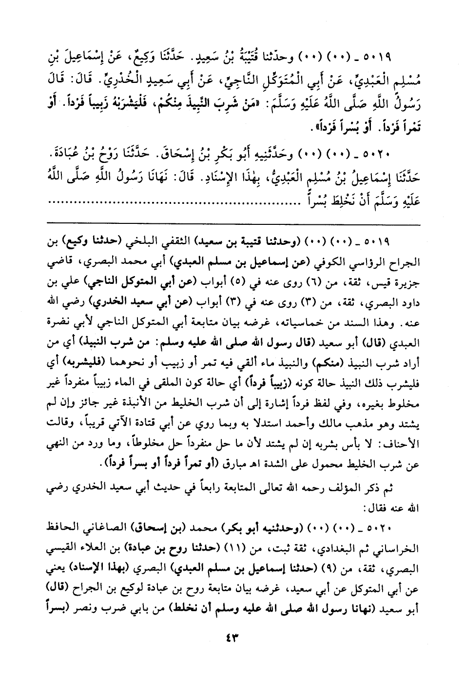 ٥٠١٩ - (٠٠) (٠٠) (وحدثنا قتيبة بن سعيد) الثَّقَفيّ البلخي (حَدَّثَنَا وكيع) بن الجراح الرؤاسي الكُوفيّ (عن إسماعيل بن مسلم العبدي) أبي محمَّد البَصْرِيّ، قاضي جزيرة قيس، ثِقَة، من (٦) روى عنه في (٥) أبواب (عن أبو المتوكل الناجي) علي بن داود البَصْرِيّ، ثِقَة، من (٣) روى عنه في (٣) أبواب (عن أبي سعيد الخُدرِيّ) رضي الله عنه. وهذا السند من خماسياته، غرضه بيان متابعة أبي المتوكل الناجي لأبي نضرة العبدي (قال) أبو سعيد (قال رسول الله صلى الله عليه وسلم: من شرب النبيد) أي من أراد شرب النبيذ (منكم) والنبيذ ماء ألقي فيه تمر أو زبيب أو نحوهما (فليشربه) أي فليشرب ذلك النبيذ حالة كونه (زبيبًا فردًا) أي حالة كون الملقى في الماء زبيبًا منفردًا غير مخلوط بغيره، وفي لفظ فردًا إشارة إلى أن شرب الخليط من الأنبذة غير جائز وإن لم يشتد وهو مذهب مالك وأَحمد استدلا به وبما روي عن أبي قتادة الآتي قريبًا، وقالت الأحناف: لا بأس بشربه إن لم يشتد لأن ما حل منفردًا حل مخلوطًا، وما ورد من النهي عن شرب الخليط محمول على الشدة اهـ مبارق (أو تمرًا فردًا أو بسرًا فردًا).