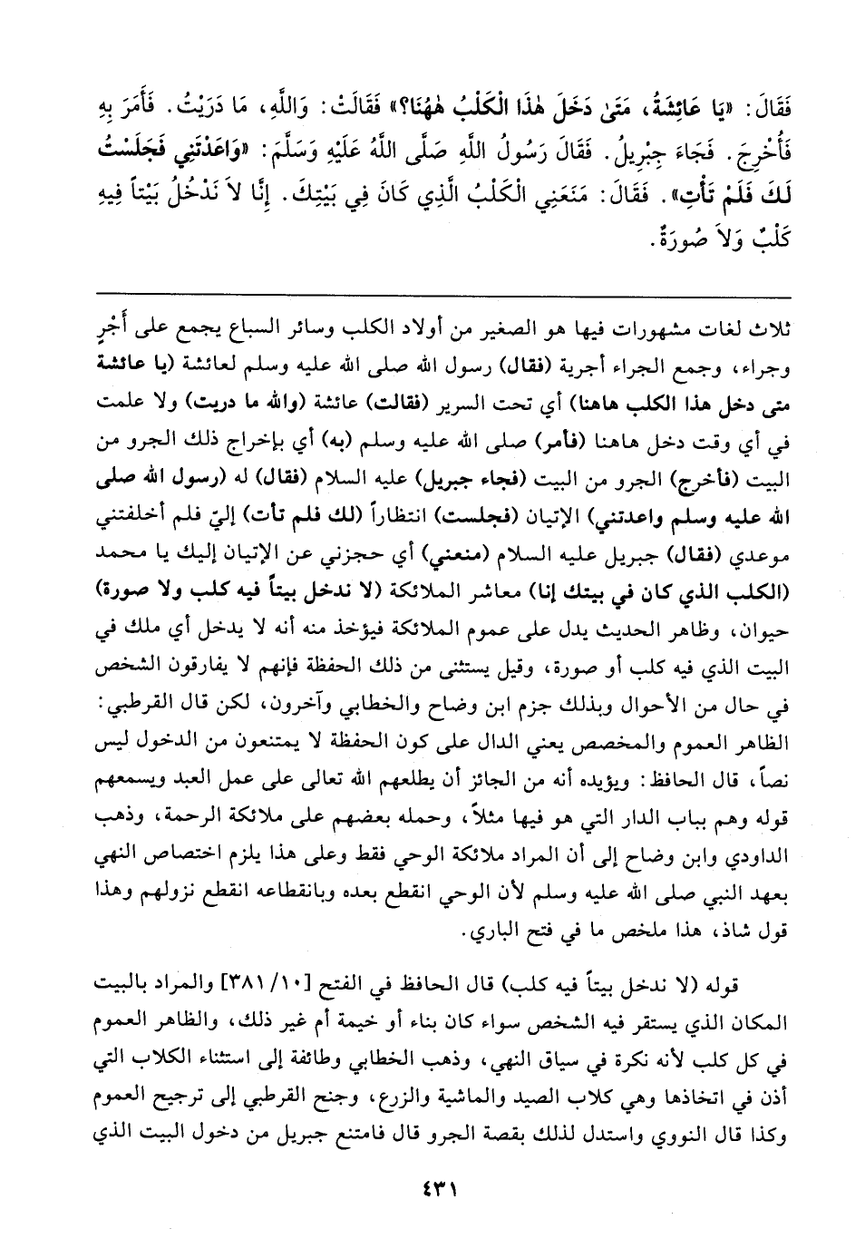 فَقَال: "يَا عَائِشَةُ، مَتَى دَخَلَ هذَا الْكَلْبُ ههُنَا؟ " فَقَالتْ: وَاللهِ، مَا دَرَيتُ. فَأَمَرَ بِهِ فَأُخْرِجَ. فَجَاءَ جِبْرِيلُ. فَقَال رَسُولُ اللهِ صَلَّى اللهُ عَلَيهِ وَسَلَّمَ: "وَاعَدْتَنِي فَجَلَسْتُ لَكَ فَلَمْ تَأْتِ". فَقَال: مَنَعَنِي الْكَلْبُ الَّذِي كَانَ فِي بَيتِكَ. إِنَّا لَا نَدْخُلُ بَيتًا فِيهِ كَلْبٌ وَلَا صُورَةٌ