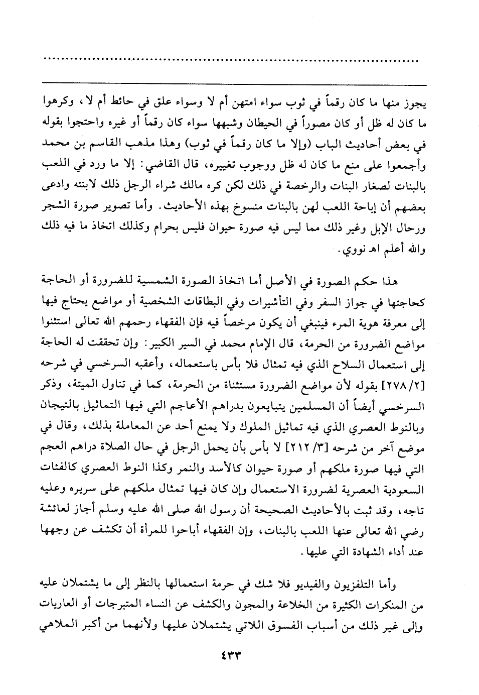 هذا حكم الصورة في الأصل أما اتخاذ الصورة الشمسية للضرورة أو الحاجة كحاجتها في جواز السفر وفي التأشيرات وفي البطاقات الشخصية أو مواضع يحتاج فيها إلى معرفة هوية المرء فينبغي أن يكون مرخصًا فيه فإن الفقهاء رحمهم الله تعالى استثنوا مواضع الضرورة من الحرمة، قال الإمام محمد في السير الكبير: كان تحققت له الحاجة إلى استعمال السلاح الذي فيه تمثال فلا بأس باستعماله، وأعقبه السرخسي في شرحه [٢/ ٢٧٨] بقوله لأن مواضع الضرورة مستثناة من الحرمة، كما في تناول الميتة، وذكر السرخسي أيضًا أن المسلمين يتبايعون بدراهم الأعاجم التي فيها التماثيل بالتيجان وبالنوط العصري الذي فيه تماثيل الملوك ولا يمنع أحد عن المعاملة بذلك، وقال في موضع آخر من شرحه [٣/ ٢١٢] لا بأس بأن يحمل الرجل في حال الصلاة دراهم العجم التي فيها صورة ملكهم أو صورة حيوان كالأسد والنمر وكذا النوط العصري كالفئات السعودية العصرية لضرورة الاستعمال هان كان فيها تمثال ملكهم على سريره وعليه تاجه، وقد ثبت بالأحاديث الصحيحة أن رسول الله صلى الله عليه وسلم أجاز لعائشة رضي الله تعالى عنها اللعب بالبنات، وإن الفقهاء أباحوا للمرأة أن تكشف عن وجهها عند أداء الشهادة التي عليها.