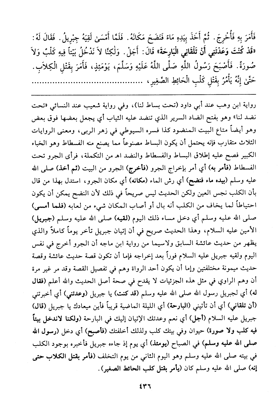 فَأَمَرَ بِهِ فَأُخْرِجَ. ثُمَّ أَخَذَ بِيَدِهِ مَاءَ فَنَضَحَ مَكَانَهُ. فَلَمَّا أَمْسَى لَقِيَهُ جِبْرِيلُ. فَقَال لَهُ: "قَدْ كُنْتَ وَعَدْتَنِي أَنْ تَلْقَانِي الْبَارِحَةَ" قَال: أَجَلْ. وَلكِنَّا لَا نَدْخُلُ بَيتًا فِيهِ كَلْبٌ وَلَا صورَةٌ. فَأَصْبَحَ رَسُولُ اللهِ صَلَّى اللهُ عَلَيهِ وَسَلَّمَ، يَوْمَئِذٍ، فَأَمَرَ بِقَتْلِ الْكِلابِ. حَتى إِنَّهُ يَأْمُرُ بِقَتْلِ كَلْبِ الْحَائِطِ الصَّغِيرِ،