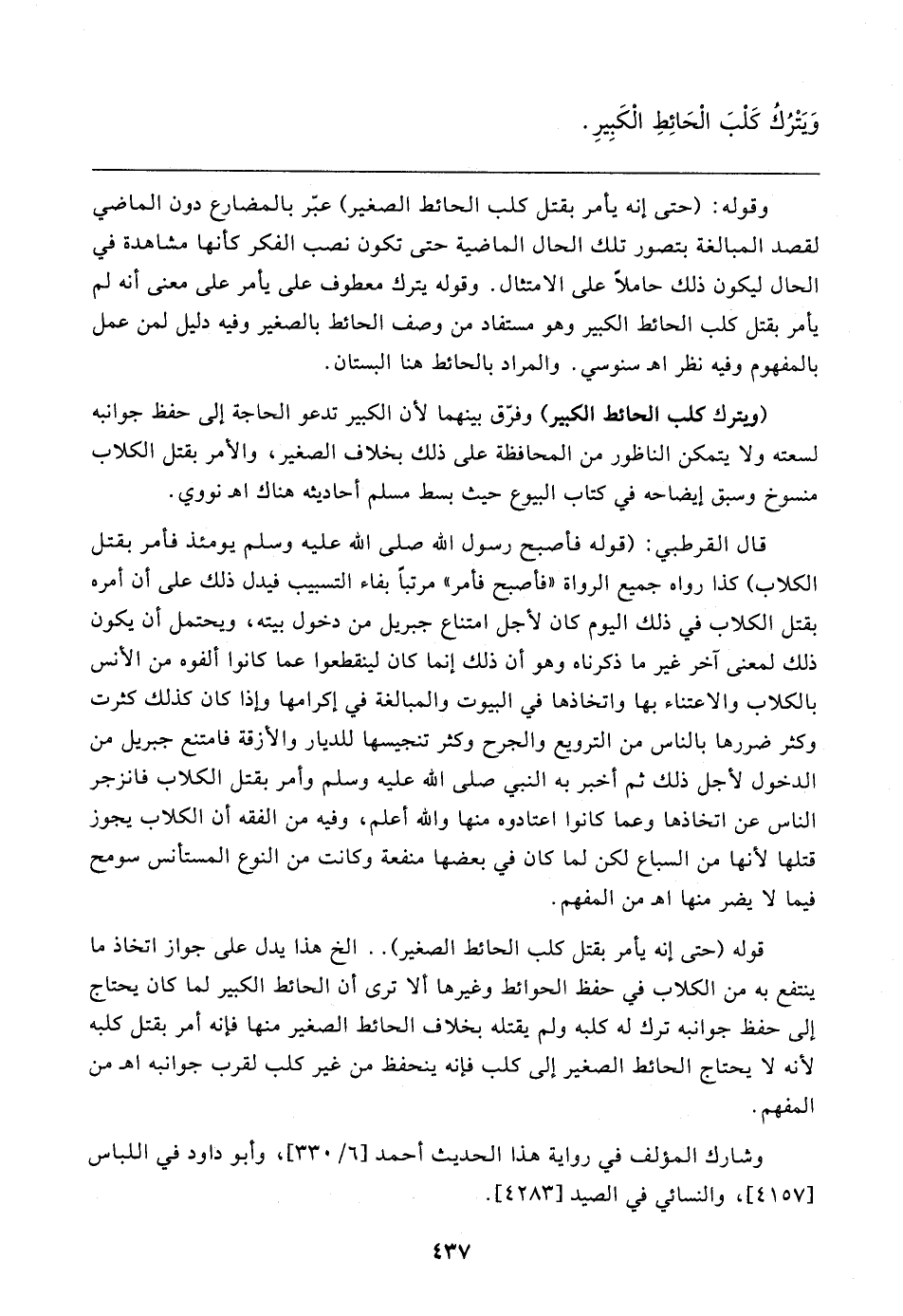 (ويترك كلب الحائط الكبير) وفرّق بينهما لأن الكبير تدعو الحاجة إلى حفظ جوانبه لسعته ولا يتمكن الناظور من المحافظة على ذلك بخلاف الصغير، والأمر بقتل الكلاب منسوخ وسبق إيضاحه في كتاب البيوع حيث بسط مسلم أحاديثه هناك اهـ نووي.