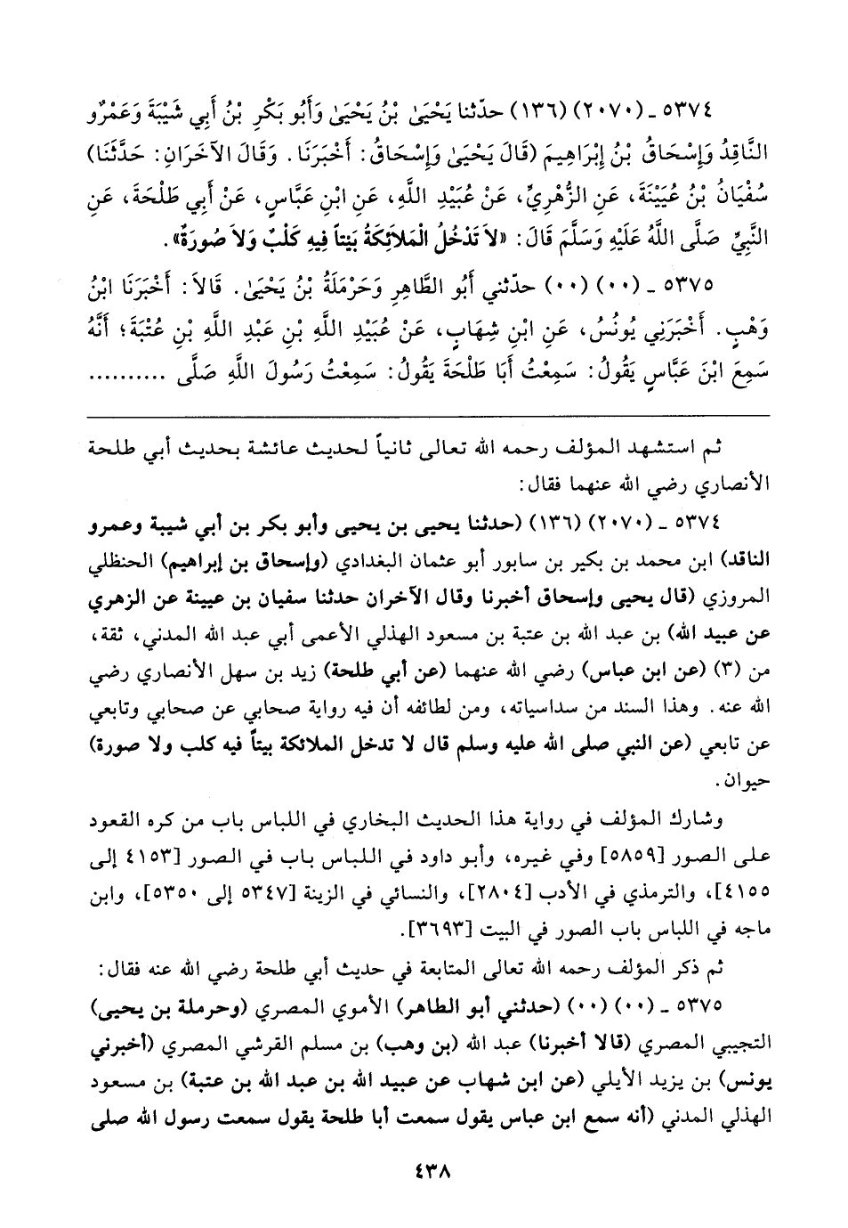 ٥٣٧٤ - (٢٠٧٠) (١٣٦) (حدثنا يحيى بن يحيى وأبو بكر بن أبي شيبة وعمرو الناقد) ابن محمد بن بكير بن سابور أبو عثمان البغدادي (وإسحاق بن إبراهيم) الحنظلي المروزي (قال يحيى وإسحاق أخبرنا وقال الآخران حدثنا سفيان بن عيينة عن الزهري عن عبيد الله) بن عبد الله بن عتبة بن مسعود الهذلي الأعمى أبي عبد الله المدني، ثقة، من (٣) (عن ابن عباس) رضي الله عنهما (عن أبي طلحة) زيد بن سهل الأنصاري رضي الله عنه. وهذا السند من سداسياته، ومن لطائفه أن فيه رواية صحابي عن صحابي وتابعي عن تابعي (عن النبي صلى الله عليه وسلم قال لا تدخل الملائكة بيتًا فيه كلب ولا صورة) حيوان.