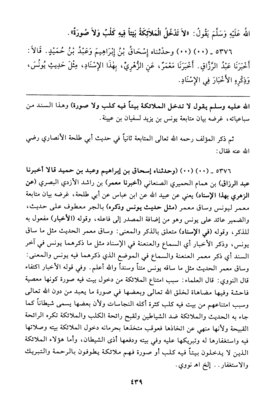 ٥٣٧٦ - (٠٠) (٠٠) (وحدثناه إسحاق بن إبراهيم وعبد بن حميد قالا أخبرنا عبد الرزاق) بن همام الحميري الصنعاني (أخبرنا معمر) بن راشد الأزدي البصري (عن الزهري بهذا الإسناد) يعني عن عبيد الله عن ابن عباس عن أبي طلحة، غرضه بيان متابعة معمر ليونس وساق معمر (مثل حديث يونس وذكره) بالجر معطوف على حديث، والضمير عائد على يونس وهو من إضافة المصدر إلى فاعله، وقوله (الأخبار) مفعول به للذكر، وقوله (في الإسناد) متعلق بالذكر والمعنى: وساق معمر الحديث مثل ما ساق يونس، وذكر الأخبار أي السماع والعنعنة في الإسناد مثل ما ذكرهما يونس في آخر السند أي ذكر معمر العنعنة والسماع في الموضع الذي ذكرهما فيه يونس والمعنى: وساق معمر الحديث مثل ما ساقه يونس متنًا وسندًا والله أعلم. وفي قوله الأخبار اكتفاء قال النووي: قال العلماء: سبب امتناع الملائكة من دخول بيت فيه صورة كونها معصية فاحشة وفيها مضاهاة لخلق الله تعالى وبعضها في صورة ما يعبد من دون الله تعالى وسبب امتناعهم من بيت فيه كلب كثرة أكله النجاسات ولأن بعضها يسمى شيطانًا كما جاء به الحديث والملائكة ضد الشياطين ولقبح رائحة الكلب والملائكة تكره الرائحة القبيحة ولأنها منهي عن اتخاذها فعوقب متخذها بحرمانه دخول الملائكة بيته وصلاتها فيه واستغفارها له وتبريكها عليه وفي بيته ودفعها أذى الشيطان، وأما هؤلاء الملائكة الذين لا يدخلون بيتا فيه كلب أو صورة فهم ملائكة يطوفون بالرحمة والتبريك والاستغفار .. إلخ اهـ نووي.