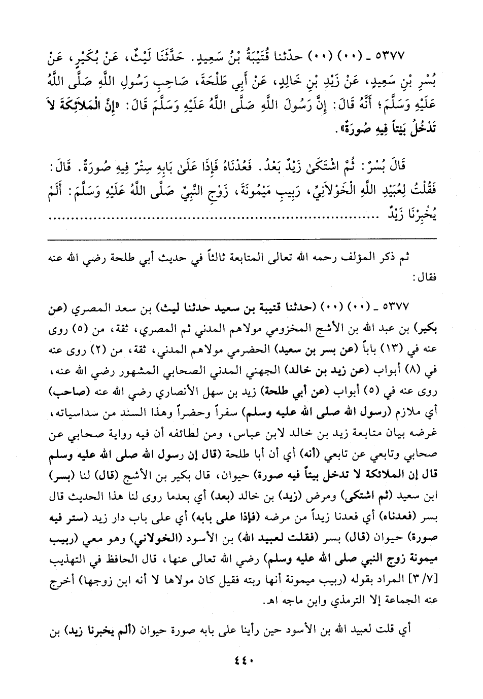 ٥٣٧٧ - (٠٠) (٠٠) حدَّثنا قُتَيبَةُ بْنُ سَعِيدٍ. حَدَّثَنَا لَيثٌ، عَنْ بُكَيرٍ، عَنْ بُسْرِ بْنِ سَعِيدٍ، عَنْ زَيدِ بْنِ خَالِدٍ، عَنْ أَبِي طَلْحَةَ، صَاحِبِ رَسُولِ اللهِ صَلَّى اللهُ عَلَيهِ وَسَلَّمَ؛ أَنَّهُ قَال: إِنَّ رَسُولَ اللهِ صَلَّى اللهُ عَلَيهِ وَسَلَّمَ قَال: "إنَّ الْمَلائكَةَ لَا تَدْخُلُ بَيتًا فِيهِ صُورَةٌ".