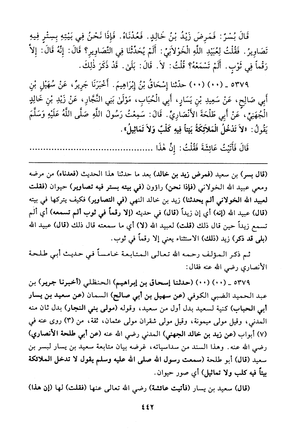 ٥٣٧٩ - (٠٠) (٠٠) حدَّثنا إِسْحَاقُ بْنُ إِبْرَاهِيمَ. أَخْبَرَنَا جَرِيرٌ، عَنْ سُهَيلِ بْنِ أَبِي صَالِحٍ، عَنْ سَعِيدِ بْنِ يَسَارٍ، أَبِي الْحُبَابِ، مَوْلَى بَنِي النَّجَّارِ، عَنْ زيدِ بْنِ خَالِدٍ الْجُهَنِيِّ، عَنْ أَبِي طَلْحَةَ الأنْصَارِيِّ. قَال: سَمِعْتُ رَسُولَ اللهِ صَلَّى اللهُ عَلَيهِ وَسَلَّمَ يَقُولُ: "لَا تَدْخُلُ الْمَلائِكَةُ بَيتًا فِيهِ كلْبٌ وَلَا تَمَاثِيلُ".