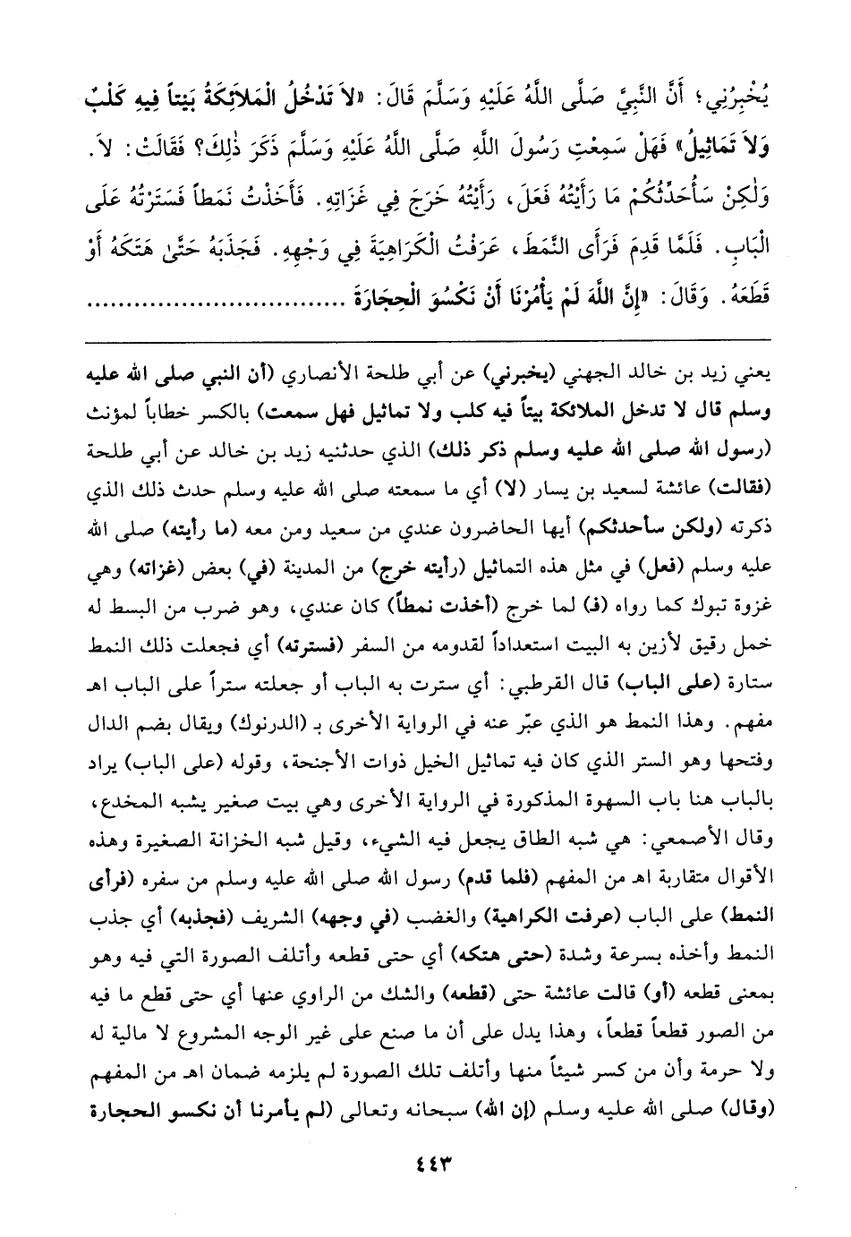 يعني زيد بن خالد الجهني (يخبرني) عن أبي طلحة الأنصاري (أن النبي صلى الله عليه وسلم قال لا تدخل الملائكة بيتًا فيه كلب ولا تماثيل فهل سمعت) بالكسر خطابًا لمؤنث (رسول الله صلى الله عليه وسلم ذكر ذلك) الذي حدثنيه زيد بن خالد عن أبي طلحة (فقالت) عائشة لسعيد بن يسار (لا) أي ما سمعته صلى الله عليه وسلم حدث ذلك الذي ذكرته (ولكن سأحدثكم) أيها الحاضرون عندي من سعيد ومن معه (ما رأيته) صلى الله عليه وسلم (فعل) في مثل هذه التماثيل (رأيته خرج) من المدينة (في) بعض (غزاته) وهي غزوة تبوك كما رواه (ذ) لما خرج (أخذت نمطًا) كان عندي، وهو ضرب من البسط له خمل رقيق لأزين به البيت استعدادًا لقدومه من السفر (فسترته) أي فجعلت ذلك النمط ستارة (على الباب) قال القرطبي: أي سترت به الباب أو جعلته سترًا على الباب اهـ مفهم. وهذا النمط هو الذي عبّر عنه في الرواية الأخرى بـ (الدرنوك) ويقال بضم الدال وفتحها وهو الستر الذي كان فيه تماثيل الخيل ذوات الأجنحة، وقوله (على الباب) يراد بالباب هنا باب السهوة المذكورة في الرواية الأخرى وهي بيت صغير يشبه المخدع، وقال الأصمعي: هي شبه الطاق يجعل فيه الشيء، وقيل شبه الخزانة الصغيرة وهذه الأقوال متقاربة اهـ من المفهم (فلما قدم) رسول الله صلى الله عليه وسلم من سفره (فرأى النمط) على الباب (عرفت الكراهية) والغضب (في وجهه) الشريف (فجذبه) أي جذب النمط وأخذه بسرعة وشدة (حتى هتكه) أي حتى قطعه وأتلف الصورة التي فيه وهو بمعنى قطعه (أو) قالت عائشة حتى (قطعه) والشك من الراوي عنها أي حتى قطع ما فيه من الصور قطعًا قطعًا، وهذا يدل على أن ما صنع على غير الوجه المشروع لا مالية له ولا حرمة وأن من كسر شيئًا منها وأتلف تلك الصورة لم يلزمه ضمان اهـ من المفهم (وقال) صلى الله عليه وسلم (إن الله) سبحانه وتعالى (لم يأمرنا أن نكسو الحجارة