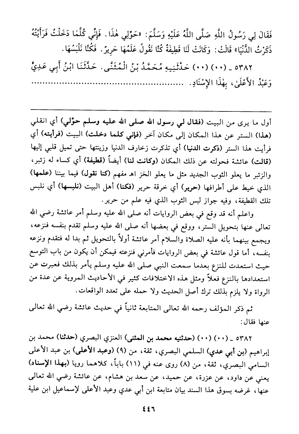٥٣٨٢ - (٠٠) (٠٠) (حدثنيه محمد بن المثنى) العنزي البصري (حدثنا) محمد بن إبراهيم (بن أبي عدي) السلمي البصري، ثقة، من (٩) (وعبد الأعلى) بن عبد الأعلى السامي البصري، ثقة، من (٨) روى عنه في (١١) بابا، كلاهما رويا (بهذا الإسناد) يعني عن داود، عن عزرة، عن حميد، عن سعد بن هشام، عن عائشة رضي الله تعالى عنها، غرضه بسوق هذا السند بيان متابعة ابن أبي عدي وعبد الأعلى لإسماعيل ابن علية