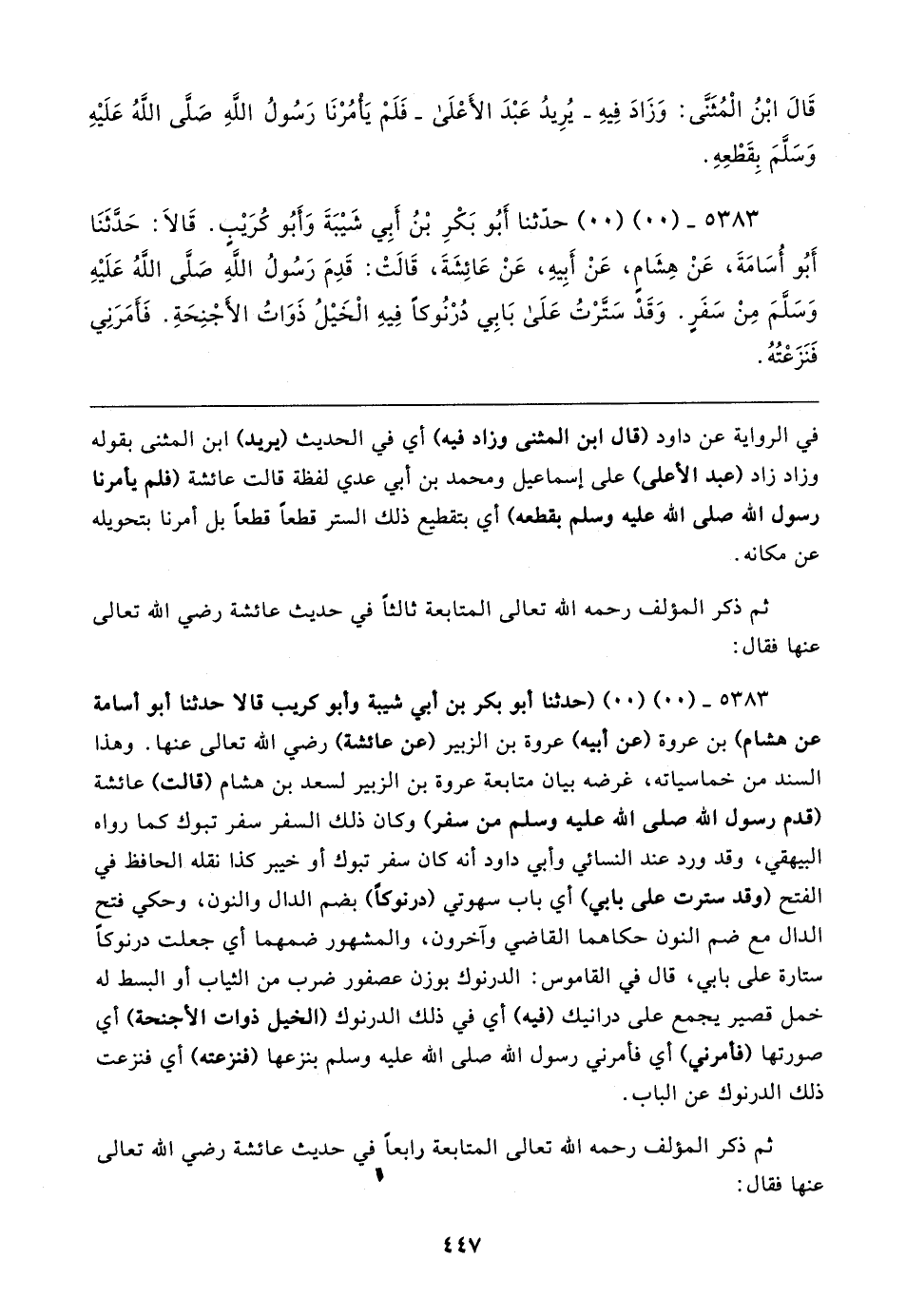 ٥٣٨٣ - (٠٠) (٠٠) (حدثنا أبو بكر بن أبي شيبة وأبو كريب قالا حدثنا أبو أسامة عن هشام) بن عروة (عن أبيه) عروة بن الزبير (عن عائشة) رضي الله تعالى عنها. وهذا السند من خماسياته، غرضه بيان متابعة عروة بن الزبير لسعد بن هشام (قالت) عائشة (قدم رسول الله صلى الله عليه وسلم من سفر) وكان ذلك السفر سفر تبوك كما رواه البيهقي، وقد ورد عند النسائي وأبي داود أنه كان سفر تبوك أو خيبر كذا نقله الحافظ في الفتح (وقد سترت على بابي) أي باب سهوتي (درنوكًا) بضم الدال والنون، وحكي فتح الدال مع ضم النون حكاهما القاضي وآخرون، والمشهور ضمهما أي جعلت درنوكًا ستارة على بابي، قال في القاموس: الدرنوك بوزن عصفور ضرب من الثياب أو البسط له خمل قمير يجمع على درانيك (فيه) أي في ذلك الدرنوك (الخيل ذوات الأجنحة) أي صورتها (فأمرني) أي فأمرني رسول الله صلى الله عليه وسلم بنزعها (فنزعته) أي فنزعت ذلك الدرنوك عن الباب.