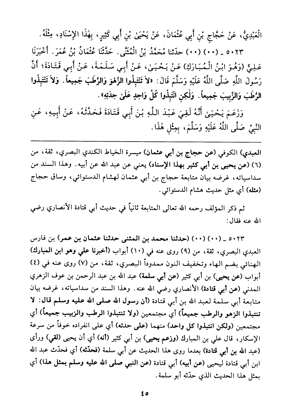 ٥٠٢٣ - (٠٠) (٠٠) (حدثنا محمَّد بن المثنَّى حَدَّثَنَا عثمان بن عمر) بن فارس العبدي البَصْرِيّ، ثِقَة، من (٩) روى عنه في (١٠) أبواب (أخبرنا علي وهو ابن المبارك) الهنائي بضم الهاء وتخفيف النُّون ممدودًا البَصْرِيّ، ثِقَة، من (٧) روى عنه في (٤) أبواب (عن يحيى) بن أبي كثير (عن أبي سلمة) عبد الله بن عبد الرَّحْمَن بن عوف الزُّهْرِيّ المدنِيُّ (عن أبي قتادة) الأَنْصَارِيّ رضي الله عنه. وهذا السند من سداسياته، غرضه بيان متابعة أبي سلمة لعبد الله بن أبي قتادة (أن رسول الله صلى الله عليه وسلم قال: لا تنتبذوا الزهو والرطب جميعًا) أي مجتمعين (ولا تنتبذوا الرطب والزبيب جميعًا) أي مجتمعين (ولكن انتبذوا كل واحد) منهما (على حدته) أي على انفراده خوفًا من سرعة الإسكار، قال علي بن المبارك (وزعم يحيى) بن أبي كثير (أنَّه) أي أن يحيى (لقي) ورأى (عبد الله بن أبي قتادة) بعد ما روى هذا الحديث عن أبي سلمة (فحدثه) أي فحدَّث عبد الله بن أبي قتادة ليحيى (عن أَبيه) أبي قتادة (عن النَّبِيّ صلى الله عليه وسلم بمثل هذا) أي بمثل هذا الحديث الذي حدَّثه أبو سلمة.