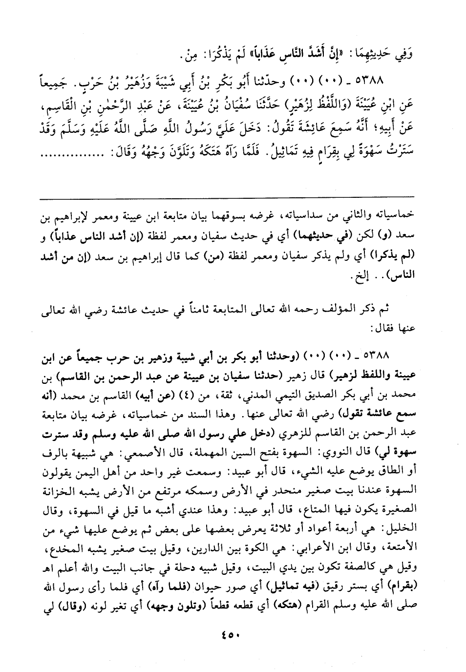 ٥٣٨٨ - (٠٠) (٠٠) وحدّثنا أَبُو بَكْرِ بْنُ أَبِي شَيبَةَ وَزُهَيرُ بْنُ حَرْبٍ. جَمِيعًا عَنِ ابْنِ عُيَينَةَ (وَاللَّفْظُ لِزُهَيرٍ) حَدَّثَنَا سُفْيَانُ بْنُ عُيَينَةَ، عَنْ عَبْدِ الرَّحْمنِ بْنِ الْقَاسِمِ، عَنْ أَبِيهِ؛ أَنَّهُ سَمِعَ عَائِشَةَ تَقُولُ: دَخَلَ عَلَيَّ رَسُولُ اللهِ صَلَّى اللهُ عَلَيهِ وَسَلَّمَ وَقَدْ سَتَرْتُ سَهْوَةً لِي بِقِرَامٍ فِيهِ تَمَاثِيلُ. فَلَمَّا رَآهُ هَتَكَهُ وَتَلَوَّنَ وَجْهُهُ وَقَال: