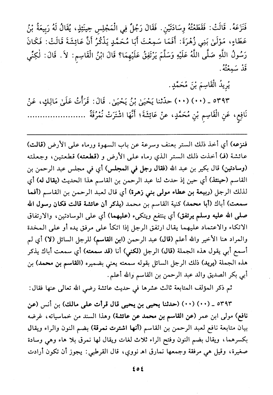 ٥٣٩٣ - (٠٠) (٠٠) حدَّثنا يَحْيَى بْنُ يَحْيَى. قَال: قَرَاتُ عَلَى مَالِكٍ، عَنْ نَافِعٍ، عَنِ الْقَاسِمِ بْنِ مُحَمَّدٍ، عنْ عَائِشَةَ؛ أَنَّهَا اشْتَرَتْ نُمْرُقَةً