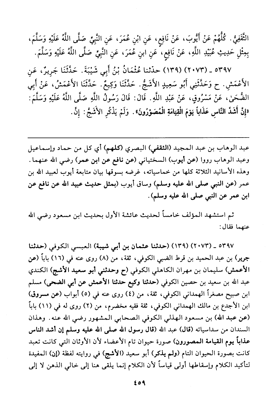 ٥٣٩٧ - (٢٠٧٣) (١٣٩) حدَّثنا عُثْمَانُ بْنُ أَبِي شَيبَةَ. حَدَّثَنَا جَرِيرٌ، عَنِ الأَعْمَشِ. ح وَحَدَّثَنِي أَبُو سَعِيدٍ الأَشَجُّ. حَدَّثَنَا وَكِيعٌ. حَدَّثَنَا الأَعْمَشُ، عَنْ أبِي الضُّحَى، عَنْ مَسْرُوقٍ، عَنْ عَبْدِ اللَّهِ. قَال: قَال رَسُولُ اللهِ صَلَّى اللهُ عَلَيهِ وَسَلَّمَ: "إِنَّ أَشَدَّ النَّاسِ عَذَابًا يَوْمَ الْقِيَامَةِ الْمُصَوِّرُونَ". وَلَمْ يَذكُرِ الأَشَجُّ: إِنَّ