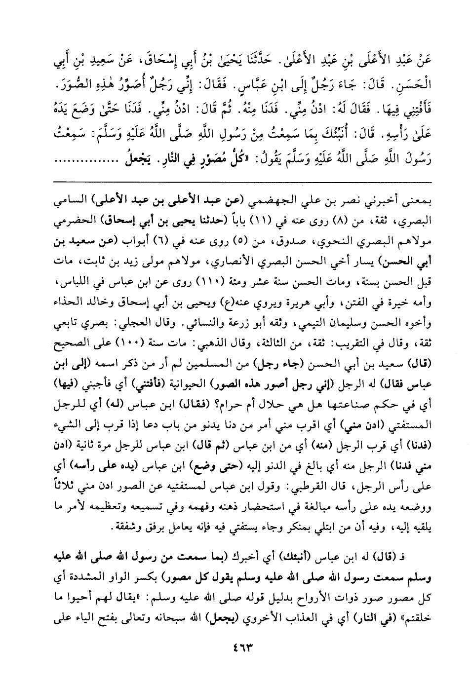 عَنْ عَبْدِ الأَعْلَى بْنِ عَبْدِ الأَعْلَى. حَدَّثَنَا يَحْيَى بْنُ أَبِي إِسْحَاقَ، عَنْ سَعِيدِ بْنِ أبِي الْحَسَنِ. قَال: جَاءَ رَجُلٌ إِلَى ابْنِ عَبَّاسٍ. فَقَال: إِنِّي رَجُلٌ أُصَوِّرُ هذِهِ الصُّوَرَ. فَأَفْتِنِي فِيهَا. فَقَال لَهُ: ادْنُ مِنِّي. فَدَنَا مِنْهُ. ثُمَّ قَال: ادْنُ مِنِّي. فَدَنَا حَتَّى وَضَعَ يَدَهُ عَلَى رَأْسِهِ. قَال: أُنَبِّئُكَ بِمَا سَمِعْتُ مِنْ رَسُولِ اللهِ صَلَّى اللهُ عَلَيهِ وَسَلَّمَ: سَمِعْتُ رَسُولَ اللهِ صَلَّى اللهُ عَلَيهِ وَسَلَّمَ يَقُولُ: "كُلُّ مُصَوِّرٍ فِي النَّارِ. يَجْعلُ