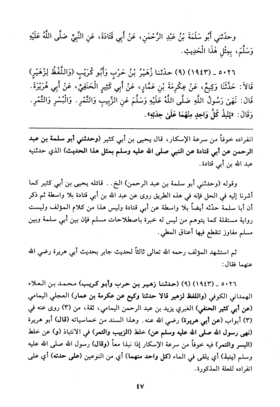 انفراده خوفًا من سرعة الإسكار، قال يحيى بن أبي كثير (وحدثني أبو سلمة بن عبد الرَّحْمَن عن أبي قتادة عن النَّبِيّ صلى الله عليه وسلم بمثل هذا الحديث) الذي حدثنيه عبد الله بن أبي قتادة.