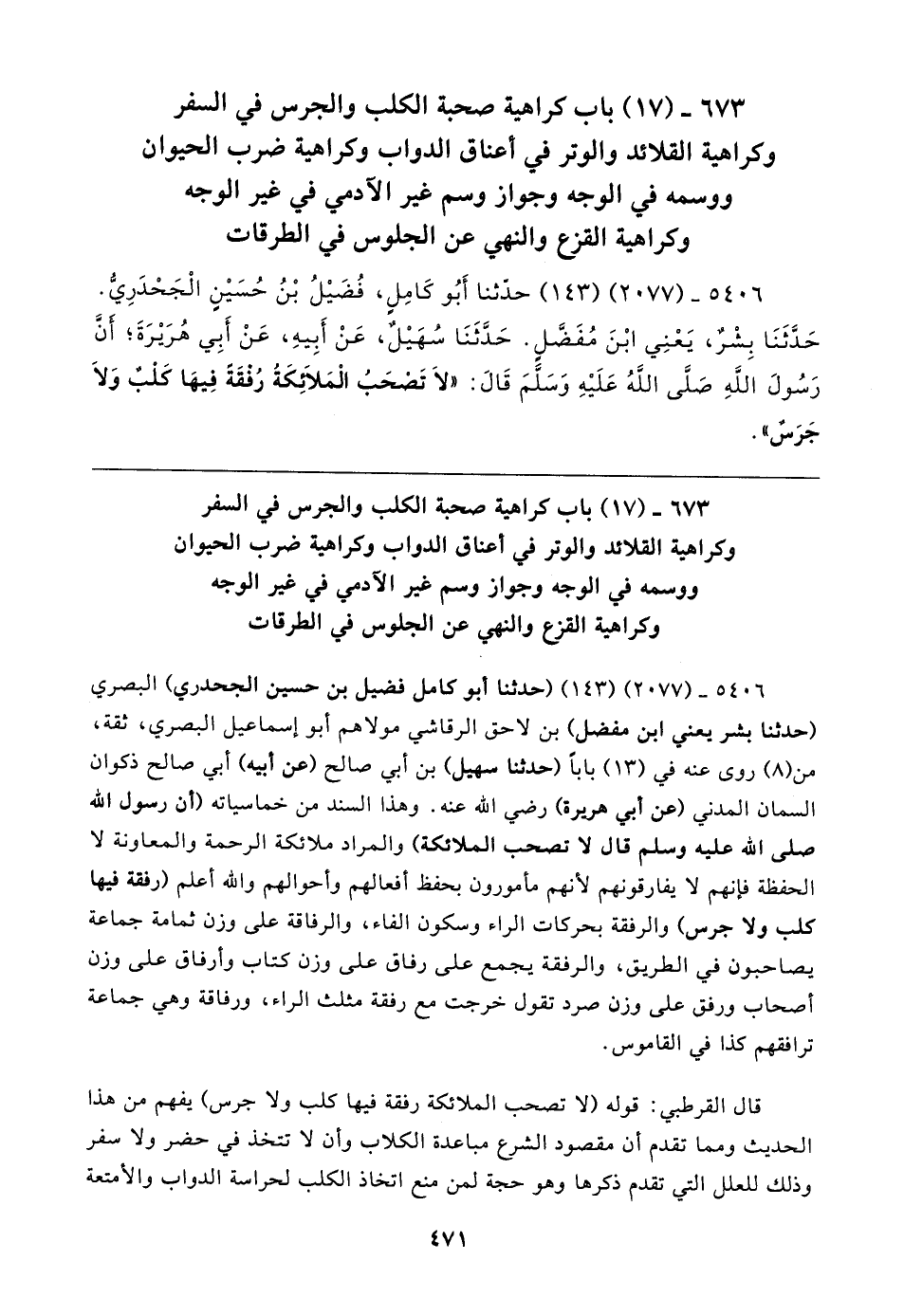 ٥٤٠٦ - (٢٠٧٧) (١٤٣) حدَّثنا أَبُو كَامِلٍ، فُضَيلُ بْنُ حُسَينٍ الْجَحْدَرِيُّ. حَدَّثَنَا بِشْرٌ، يَعْنِي ابْنَ مُفَضَّل. حَدَّثَنَا سُهَيلٌ، عَنْ أَبِيهِ، عَنْ أَبِي هُرَيرَةَ؛ أَنَّ رَسُولَ اللهِ صَلَّى اللهُ عَلَيهِ وَسَلَّمَ قَال: "لَا تَصْحَبُ الْمَلائكَةُ رُفْقَةَ فِيهَا كَلْبٌ وَلَا جَرَسٌ"