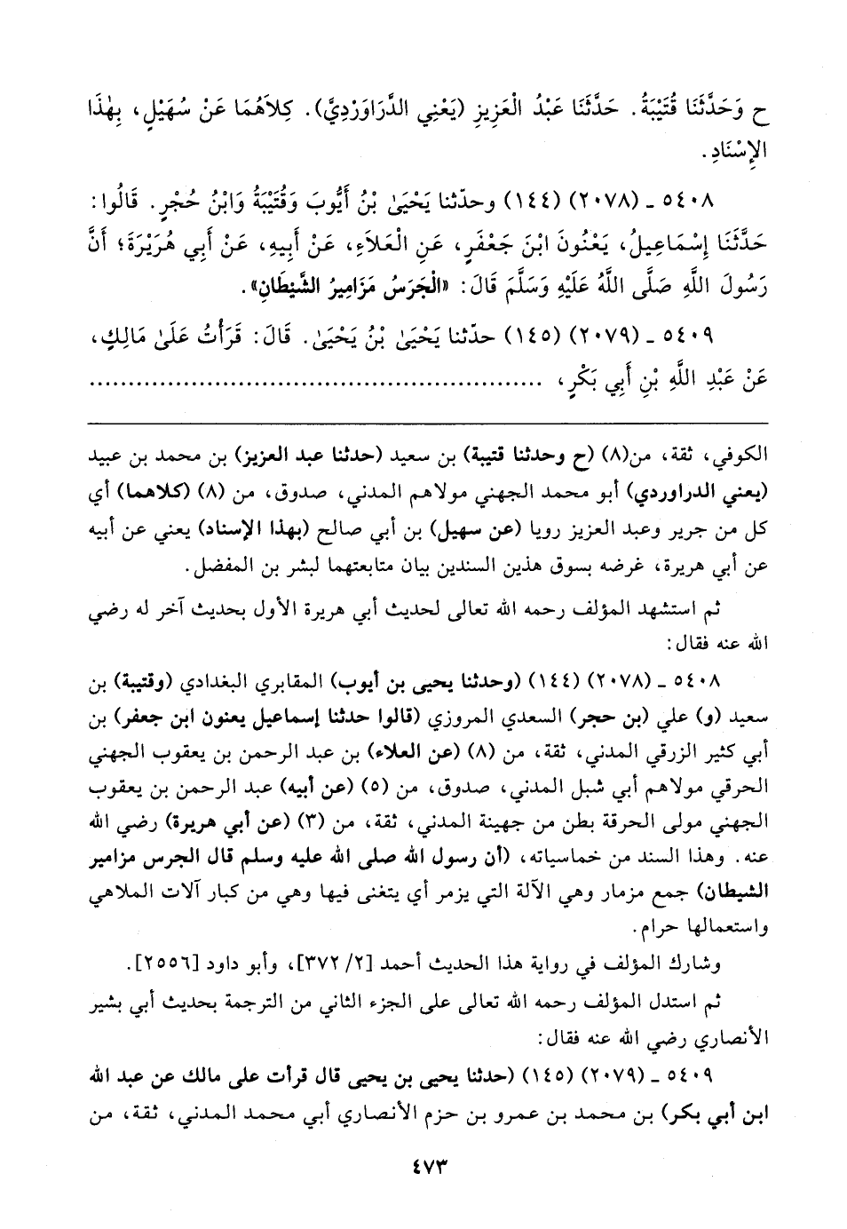 ٥٤٠٨ - (٢٠٧٨) (١٤٤) (وحدثنا يحيى بن أيوب) المقابري البغدادي (وقتيبة) بن سعيد (و) علي (بن حجر) السعدي المروزي (قالوا حدثنا إسماعيل يعنون ابن جعفر) بن أبي كثير الزرقي المدني، ثقة، من (٨) (عن العلاء) بن عبد الرحمن بن يعقوب الجهني الحرقي مولاهم أبي شبل المدني، صدوق، من (٥) (عن أبيه) عبد الرحمن بن يعقوب الجهني مولى الحرقة بطن من جهينة المدني، ثقة، من (٣) (عن أبي هريرة) رضي الله عنه. وهذا السند من خماسياته، (أن رسول الله صلى الله عليه وسلم قال الجرس مزامير الشيطان) جمع مزمار وهي الآلة التي يزمر أي يتغنى فيها وهي من كبار آلات الملاهي واستعمالها حرام.