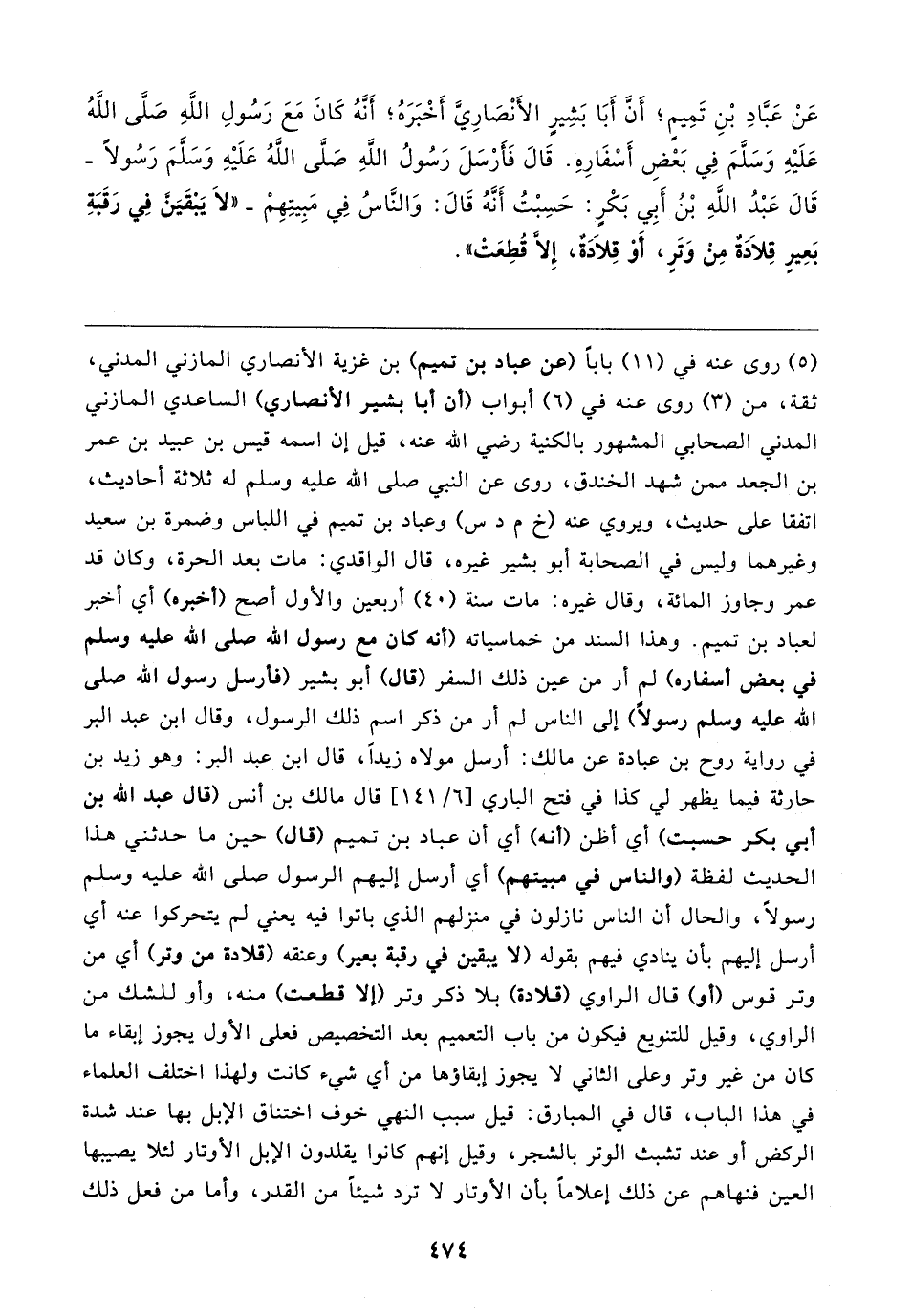 عَنْ عَبَّادِ بْنِ تَمِيمٍ؛ أَنَّ أَبَا بَشِيرٍ الأَنْصَارِيَّ أَخْبَرَهُ؛ أَنَّهُ كَانَ مَعَ رَسُولِ اللهِ صَلَّى اللهُ عَلَيهِ وَسَلَّمَ فِي بَعْضِ أَسْفَارِهِ. قَال فَأرْسَلَ رَسُولُ اللهِ صَلَّى اللهُ عَلَيهِ وَسَلَّمَ رَسُولًا -قَال عَبْدُ اللهِ بْنُ أَبِي بَكْرٍ: حَسِبْتُ أَنَّهُ قَال: وَالنَّاسُ فِي مَبِيتِهِمْ- "لَا يَبْقَيَنَّ فِي رَقَبَةِ بَعِيرٍ قِلادَةٌ مِنْ وَتَرٍ، أَوْ قِلادَةٌ، إِلَا قُطِعَتْ"