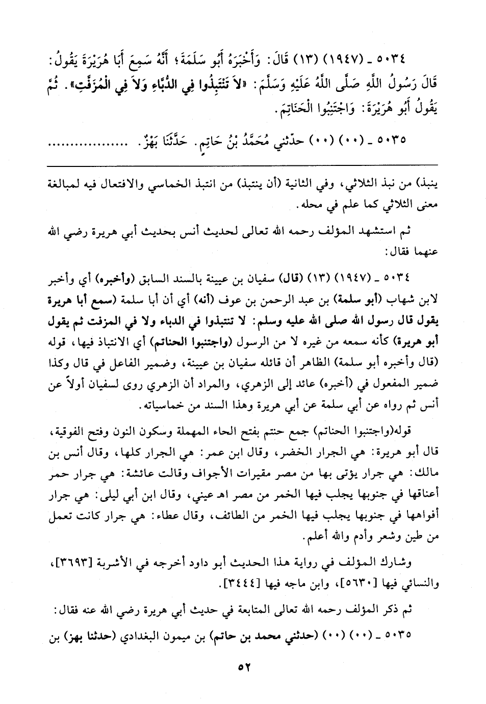 ٥٠٣٤ - (١٩٤٧) (١٣) قَال: وَأَخْبَرَهُ أَبُو سَلَمَةَ؛ أَنَّهُ سَمِعَ أَبَا هُرَيرَةَ يَقُولُ: قَال رَسُولُ اللهِ صلى الله عَلَيهِ وَسلمَ: "لا تَنْتَبِذُوا في الدباءِ وَلا في المُزَفَّتِ". ثُمَّ يَقُولُ أَبُو هُرَيرَةَ: وَاجْتَنِبُوا الحَنَاتِمَ.