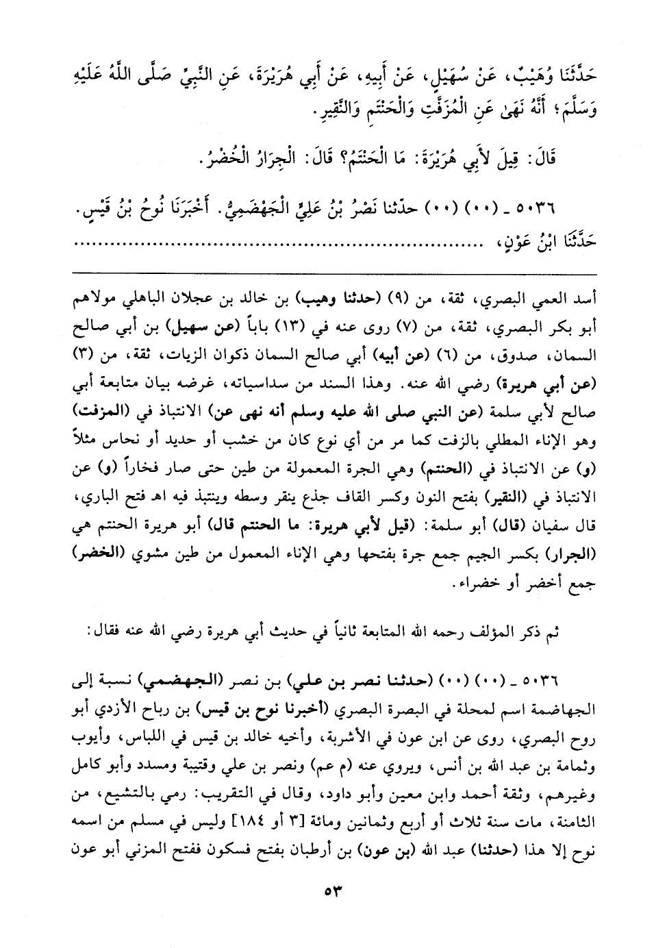 أسد العمي البَصْرِيّ، ثِقَة، من (٩) (حَدَّثَنَا وهيب) بن خالد بن عجلان الباهليّ مولاهم أبو بكر البَصْرِيّ، ثِقَة، من (٧) روى عنه في (١٣) بابا (عن سهيل) بن أبي صالح السمان، صدوق، من (٦) (عن أَبيه) أبي صالح السمان ذكوان الزَّيات، ثِقَة، من (٣) (عن أبي هريرة) رضي الله عنه. وهذا السند من سداسياته، غرضه بيان متابعة أبي صالح لأبي سلمة (عن النَّبِيّ صلى الله عليه وسلم أنَّه نهى عن) الانتباذ في (المزفت) وهو الإناء المطلي بالزفت كما مر من أي نوع كان من خشب أو حديد أو نحاس مثلًا (و) عن الانتباذ في (الحنتم) وهو الجرة المعمولة من طين حتَّى صار فخارًا (و) عن الانتباذ في (النقير) بفتح النُّون وكسر القاف جذع ينقر وسطه وينتبذ فيه اهـ فتح الباري، قال سفيان (قال) أبو سلمة: (قيل لأبي هريرة: ما الحنتم قال) أبو هريرة الحنتم هي (الجرار) بكسر الجيم جمع جرة بفتحها وهو الإناء المعمول من طين مشوي (الخضر) جمع أخضر أو خضراء.