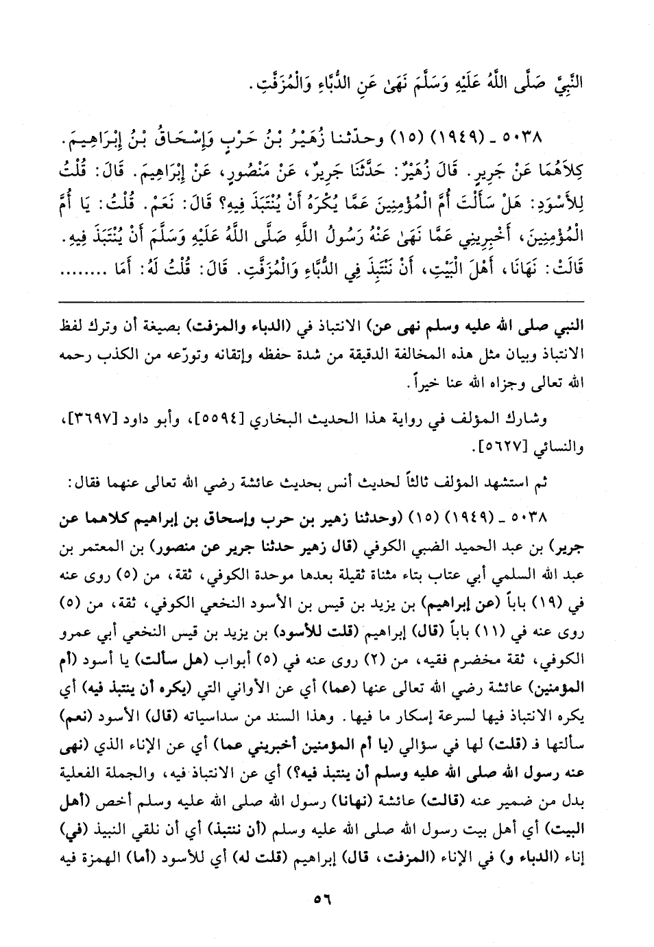 ٥٠٣٨ - (١٩٤٩) (١٥) وحدثنا زُهَيرُ بْنُ حَرْبٍ وإسْحَاقُ بْنُ إِبْرَاهِيمَ. كِلاهُمَا عَنْ جَرِيرٍ. قَال زُهَيرٌ: حَدَّثَنَا جَرِيرٌ، عَنْ مَنْصُورٍ، عَنْ إِبْرَاهِيمَ. قَال: قُلتُ لِلأَسْوَدِ: هَل سَألتَ أمَّ المُومِنِينَ عَمَّا يُكْرَهُ أَنْ يُنْتَبَذَ فِيهِ؟ قَال: نَعَمْ. قُلتُ: يَا أُمَّ المُؤْمِنِينَ، أَخْبِرِينِي عَمَّا نَهَى عَنْهُ رَسُولُ اللهِ صَلَّى اللهُ عَلَيهِ وَسَلمَ أنْ يُنْتَبَذَ فِيهِ. قَالتْ: نَهَانَا، أَهْلَ البَيتِ، أَنْ نَنْتَبِذَ في الدُّبَّاءِ وَالمُزَفَّتِ. قَال: قُلتُ لَهُ: أَمَا