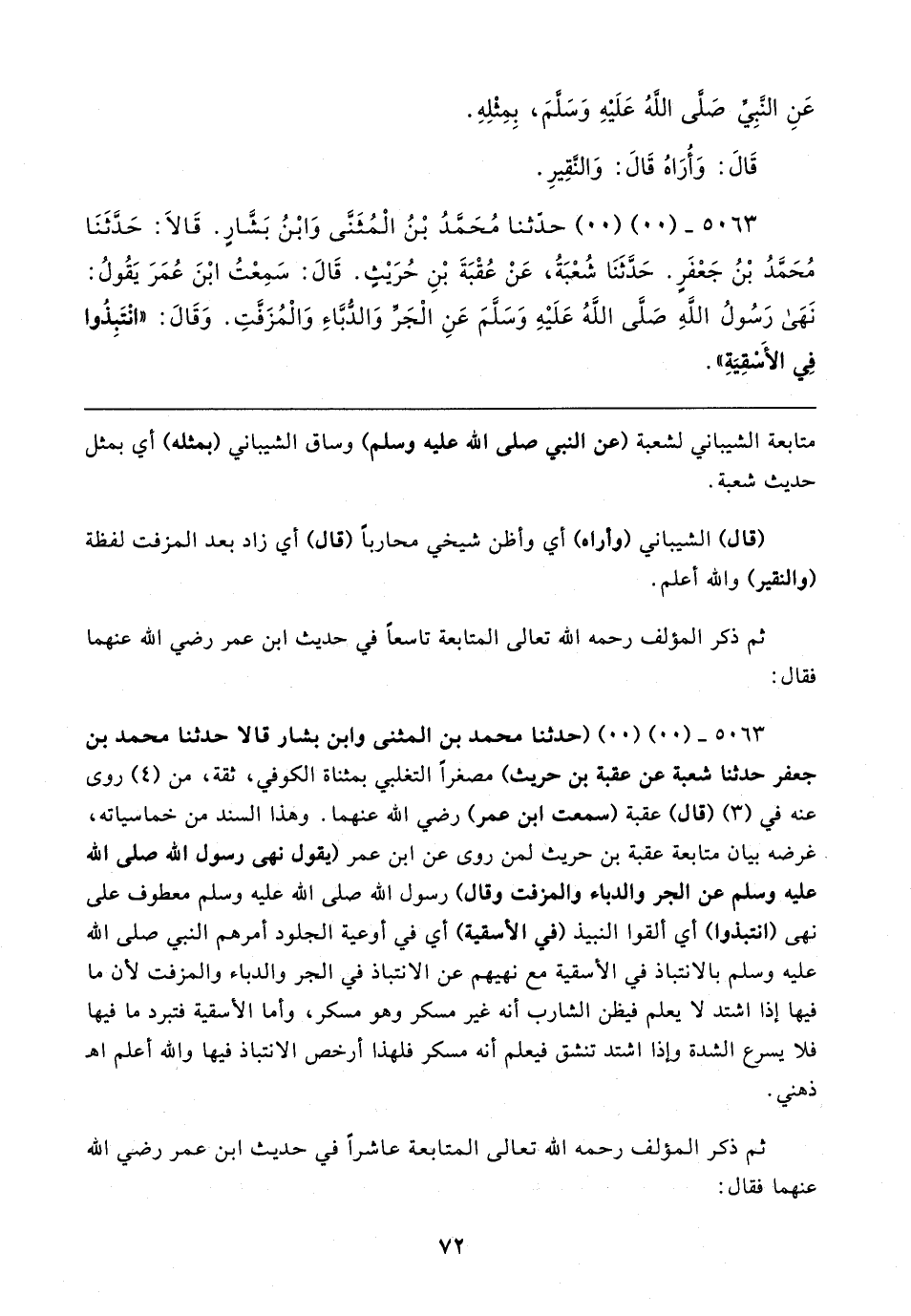 ٥٠٦٣ - (٠٠) (٠٠) (حدثنا محمَّد بن المثنَّى وابن بشار قالا حَدَّثَنَا محمَّد بن جعفر حَدَّثَنَا شعبة عن عقبة بن حريث) مصغرًا التغلبي بمثناة الكُوفيّ، ثِقَة، من (٤) روى عنه في (٣) (قال) عقبة (سمعت ابن عمر) رضي الله عنهما. وهذا السند من خماسياته، غرضه بيان متابعة عقبة بن حريث لمن روى عن ابن عمر (يقول نهى رسول الله صلى الله عليه وسلم عن الجر والدباء والمزفت وقال) رسول الله صلى الله عليه وسلم معطوف على نهى (انتبذوا) أي ألقوا النبيذ (في الأسقية) أي في أوعية الجلود أمرهم النَّبِيّ صلى الله عليه وسلم بالانتباذ في الأسقية مع نهيهم عن الانتباذ في الجر والدباء والمزفت لأن ما فيها إذا اشتد لا يعلم فيظن الشارب أنَّه غير مسكر وهو مسكر، وأما الأسقية فتبرد ما فيها فلا يسرع الشدة وإذا اشتد تنشق فيعلم أنَّه مسكر فلهذا أرخص الانتباذ فيها والله أعلم اهـ ذهني.