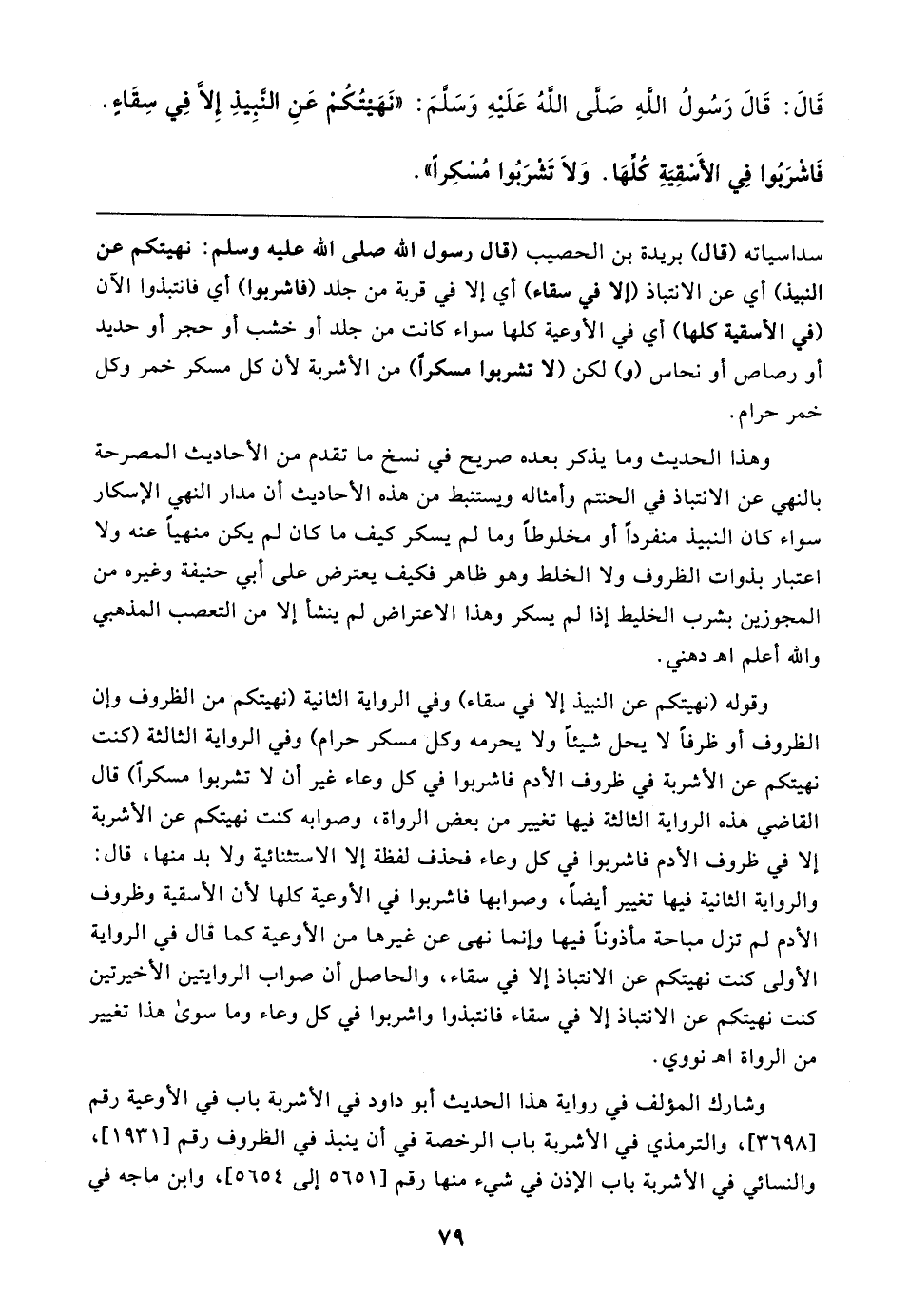 وقوله (نهيتكم عن النبيذ إلا في سقاء) وفي الرواية الثَّانية (نهيتكم من الظروف وإن الظروف أو ظرفًا لا يحل شيئًاولا يحرمه وكل مسكر حرام) وفي الرواية الثالثة (كنت نهيتكم عن الأشربة في ظروف الأدم فاشربوا في كل وعاء غير أن لا تشربوا مسكرًا) قال القاضي هذه الرواية الثالثة فيها تغيير من بعض الرواة، وصوابه كنت نهيتكم عن الأشربة إلَّا في ظروف الأدم فاشربوا في كل وعاء فحذف لفظة إلَّا الاستثنائية ولا بد منها، قال: والرواية الثَّانية فيها تغيير أَيضًا، وصوابها فاشربوا في الأوعية كلها لأن الأسقية وظروف الأدم لم تزل مباحة مأذونًا فيها وإنما نهى عن غيرها من الأوعية كما قال في الرواية الأولى كنت نهيتكم عن الانتباذ إلَّا في سقاء، والحاصل أن صواب الروايتين الأخيرتين كنت نهيتكم عن الانتباذ إلَّا في سقاء فانتبذوا واشربوا في كل وعاء وما سوى هذا تغيير من الرواة اهـ نووي.