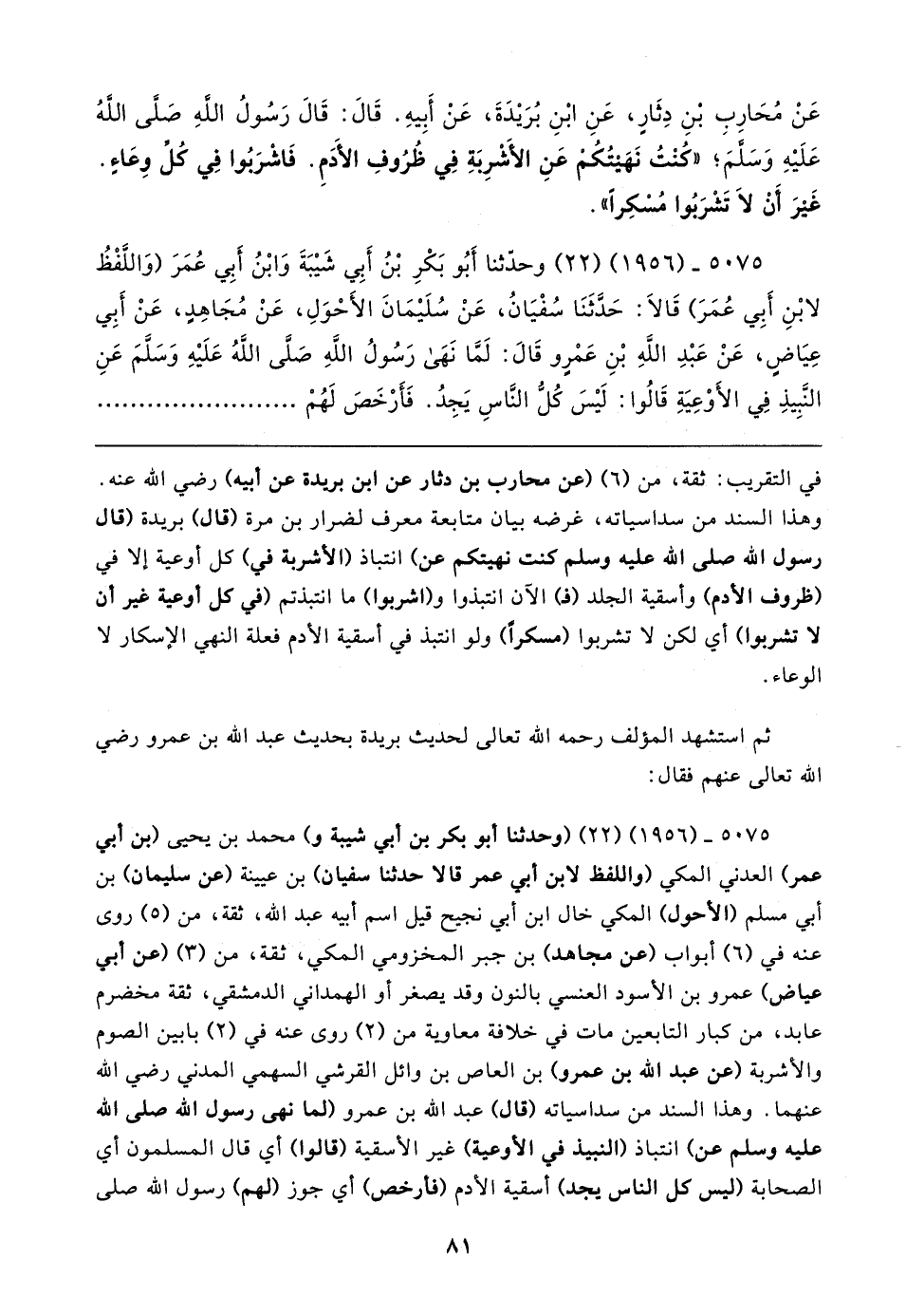 عَنْ مُحَارِبِ بنِ دِثَارٍ، عَنِ ابْنِ بُرَيدَةَ، عَنْ أَبِيهِ. قَال: قَال رَسُولُ اللهِ صَلى الله عَلَيهِ وَسلَّمَ؛ "كُنْتُ نَهَيتُكُمْ عَنِ الأَشْرِبَةِ في ظُرُوفِ الأَدَمِ. فَاشْرَبُوا في كُل وعَاءٍ. غَيرَ أَنْ لا تَشْرَبُوا مُسْكِرًا".