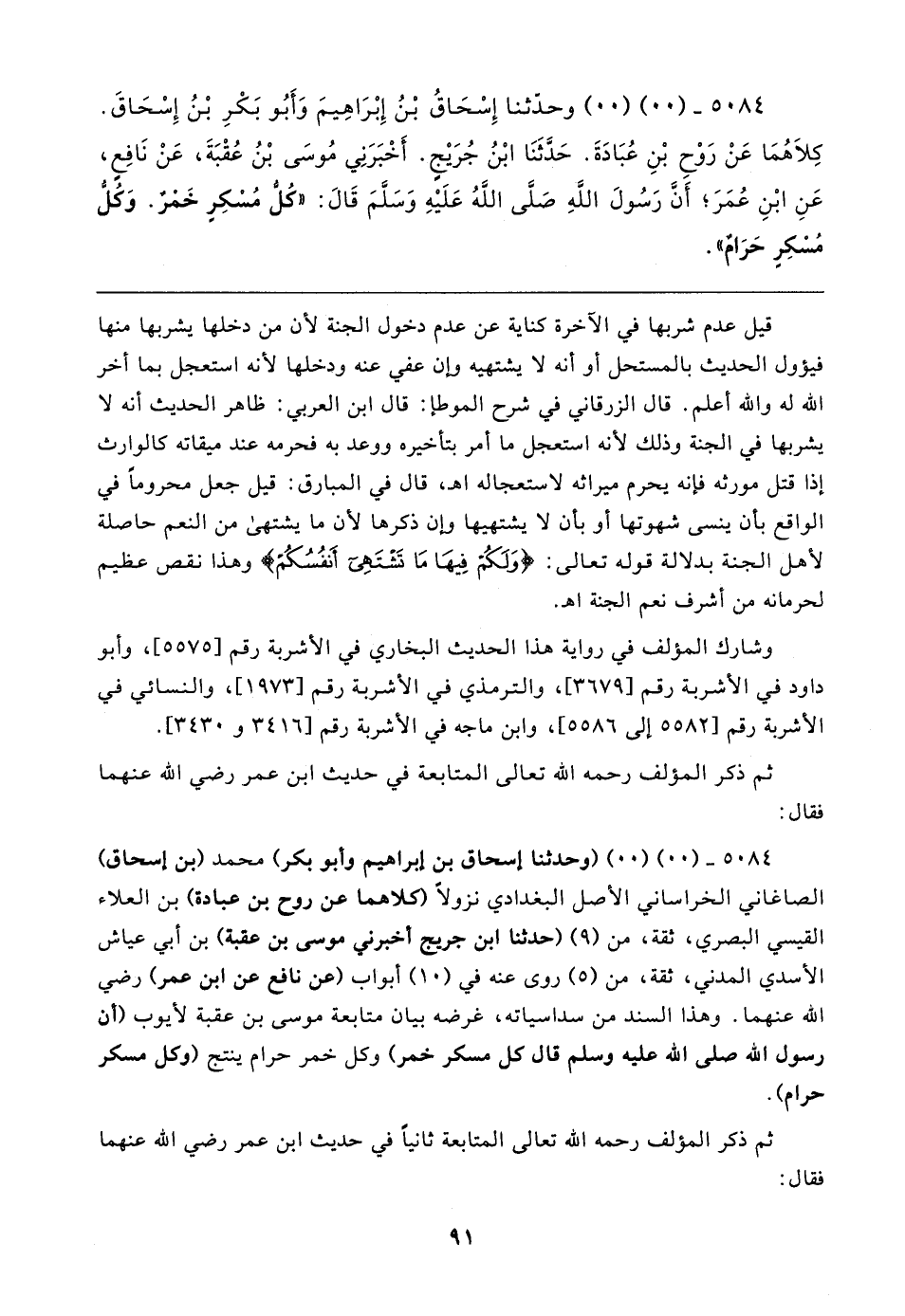 ٥٠٨٤ - (٠٠) (٠٠) (وحدثنا إسحاق بن إبراهيم وأبو بكر) محمد (بن إسحاق) الصاغاني الخراساني الأصل البغدادي نزولًا (كلاهما عن روح بن عبادة) بن العلاء القيسي البصري، ثقة، من (٩) (حدثنا ابن جريج أخبرني موسى بن عقبة) بن أبي عياش الأسدي المدني، ثقة، من (٥) روى عنه في (١٠) أبواب (عن نافع عن ابن عمر) رضي الله عنهما. وهذا السند من سداسياته، غرضه بيان متابعة موسى بن عقبة لأيوب (أن رسول الله صلى الله عليه وسلم قال كل مسكر خمر) وكل خمر حرام ينتج (وكل مسكر حرام).