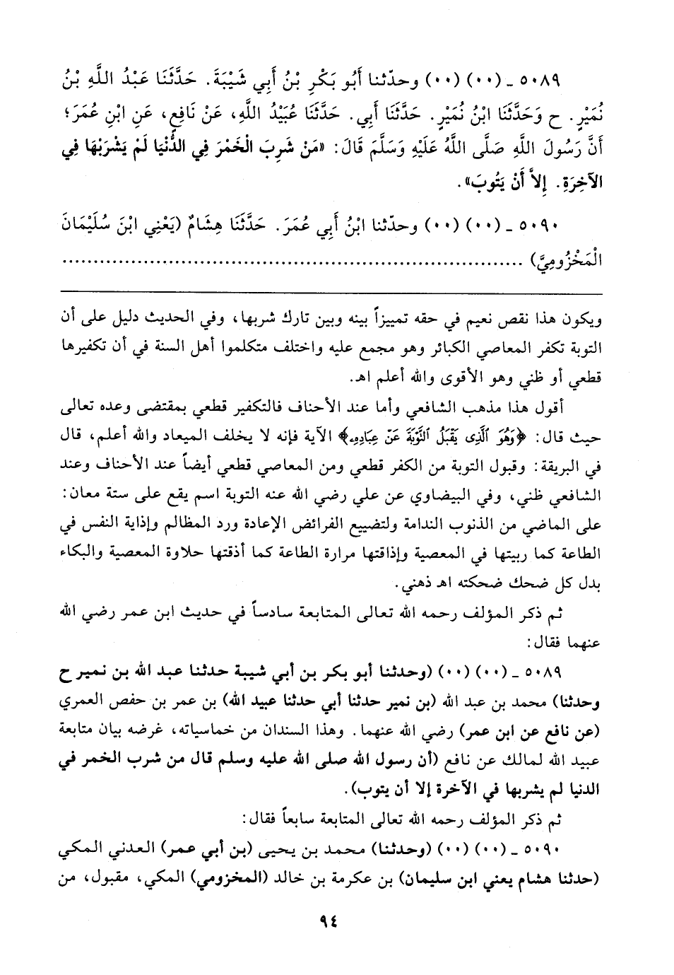 ٥٠٨٩ - (٠٠) (٠٠) (وحدثنا أبو بكر بن أبي شيبة حدثنا عبد الله بن نمير ح وحدثنا) محمد بن عبد الله (بن نمير حدثنا أبي حدثنا عبيد الله) بن عمر بن حفص العمري (عن نافع عن ابن عمر) رضي الله عنهما. وهذا السندان من خماسياته، غرضه بيان متابعة عبيد الله لمالك عن نافع (أن رسول الله صلى الله عليه وسلم قال من شرب الخمر في الدنيا لم يشربها في الآخرة إلَّا أن يتوب).
