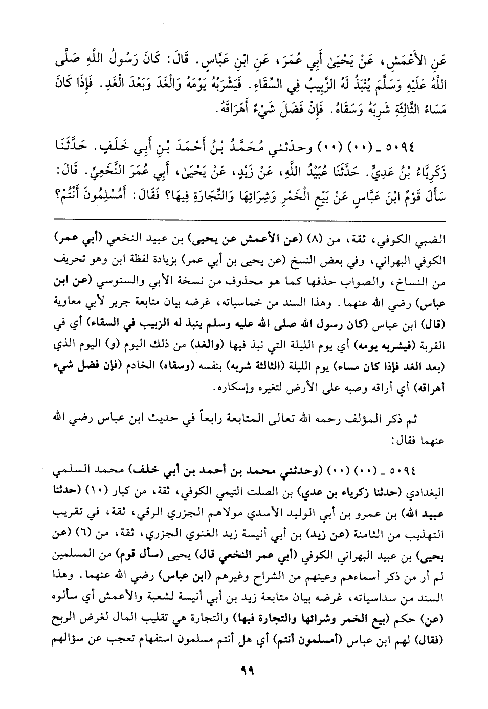 ٥٠٩٤ - (٠٠) (٠٠) وحدّثني مُحَمَّدُ بْنُ أَحْمَدَ بْنِ أبِي خَلَفٍ. حَدَّثَنَا زَكَرِيَّاءُ بْنُ عَدِيٍّ. حَدَّثَنَا عُبَيدُ اللهِ، عَنْ زَيدٍ، عَنْ يَحْيَى، أَبِي عُمَرَ النَّخَعِيِّ. قَال: سَأَلَ قَوْمٌ ابْنَ عَبَّاسٍ عَنْ بَيعِ الْخَمْرِ وَشِرَائِهَا وَالتِّجَارَةِ فِيهَا؟ فَقَال: أَمُسْلِمُونَ أَنْتُمْ؟