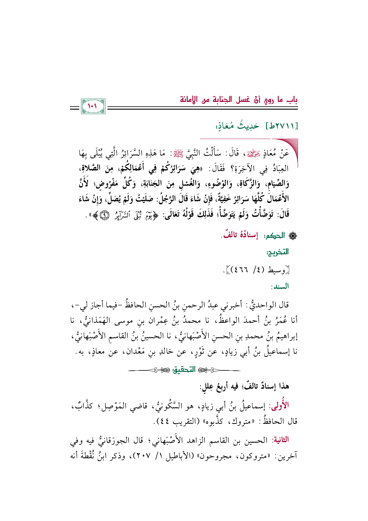 قال الواحديُّ: أخبرني عبدُ الرحمنِ بنُ الحسنِ الحافظُ -فيما أجاز لي-، أنا عُمَرُ بنُ أحمدَ الواعظُ، نا محمدُ بنُ عِمْران بنِ موسى الهَمَذانيُّ، نا إبراهيمُ بنُ محمدِ بنِ الحسنِ الأَصْبَهانيُّ، نا الحسينُ بنُ القاسمِ الأَصْبَهانيُّ، نا إسماعيلُ بنُ أبي زيادٍ، عن ثَوْرٍ، عن خالدِ بنِ مَعْدان، عن معاذٍ، به.