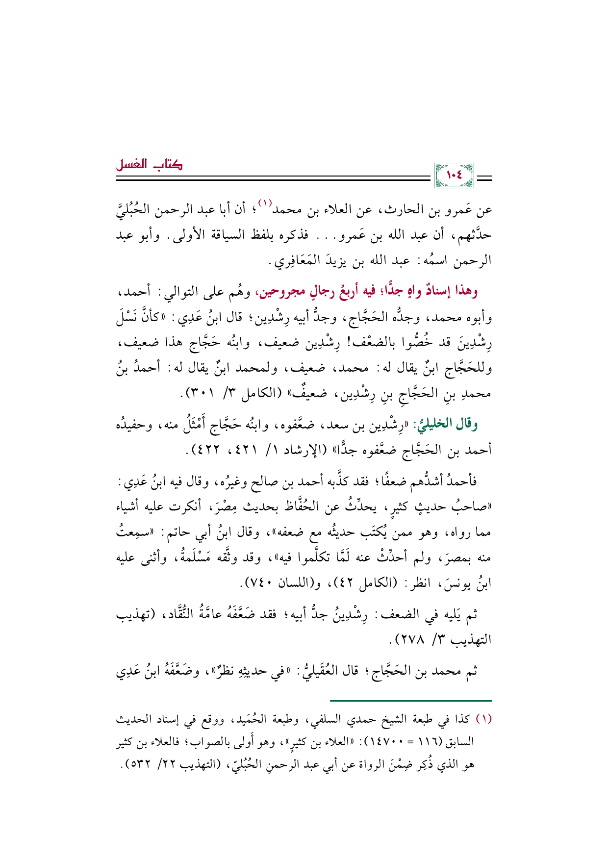 وهذا إسنادٌ واهٍ جدًّا؛ فيه أربعُ رجالٍ مجروحين، وهُم على التوالي: أحمد، وأبوه محمد، وجدُّه الحَجَّاج، وجدُّ أبيه رِشْدِين؛ قال ابنُ عَدِي: "كأنَّ نَسْلَ رِشْدِينَ قد خُصُّوا بالضعْف! رِشْدِين ضعيف، وابنُه حَجَّاج هذا ضعيف، وللحَجَّاج ابنٌ يقال له: محمد، ضعيف، ولمحمد ابنٌ يقال له: أحمدُ بنُ محمدِ بنِ الحَجَّاجِ بنِ رِشْدِين، ضعيفٌ" (الكامل ٣/ ٣٠١).