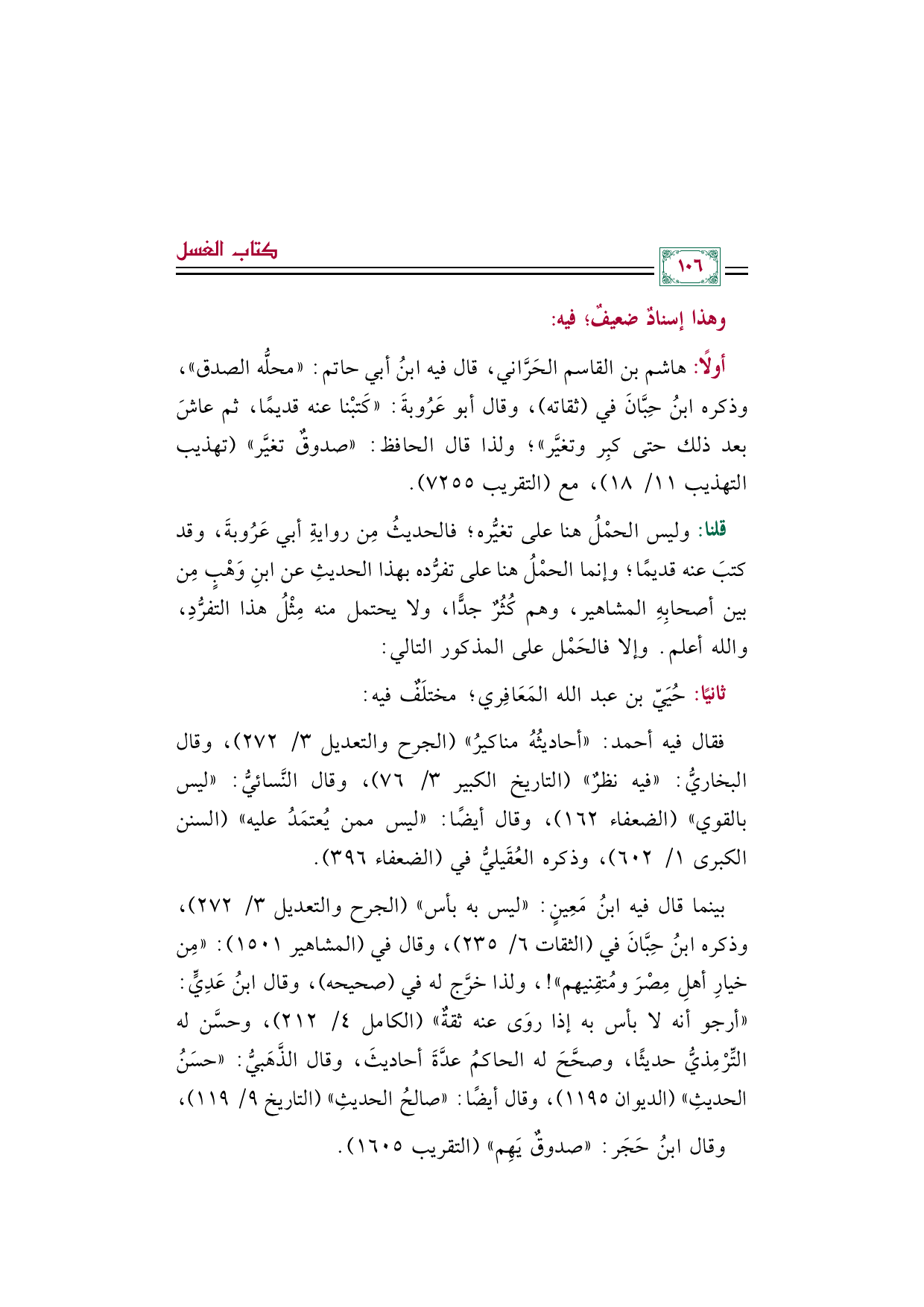 أولًا: هاشم بن القاسم الحَرَّاني، قال فيه ابنُ أبي حاتم: "محلُّه الصدق"، وذكره ابنُ حِبَّانَ في (ثقاته)، وقال أبو عَرُوبةَ: "كَتبْنا عنه قديمًا، ثم عاشَ بعد ذلك حتى كبِر وتغيَّر"؛ ولذا قال الحافظ: "صدوقٌ تغيَّر" (تهذيب التهذيب ١١/ ١٨)، مع (التقريب ٧٢٥٥).