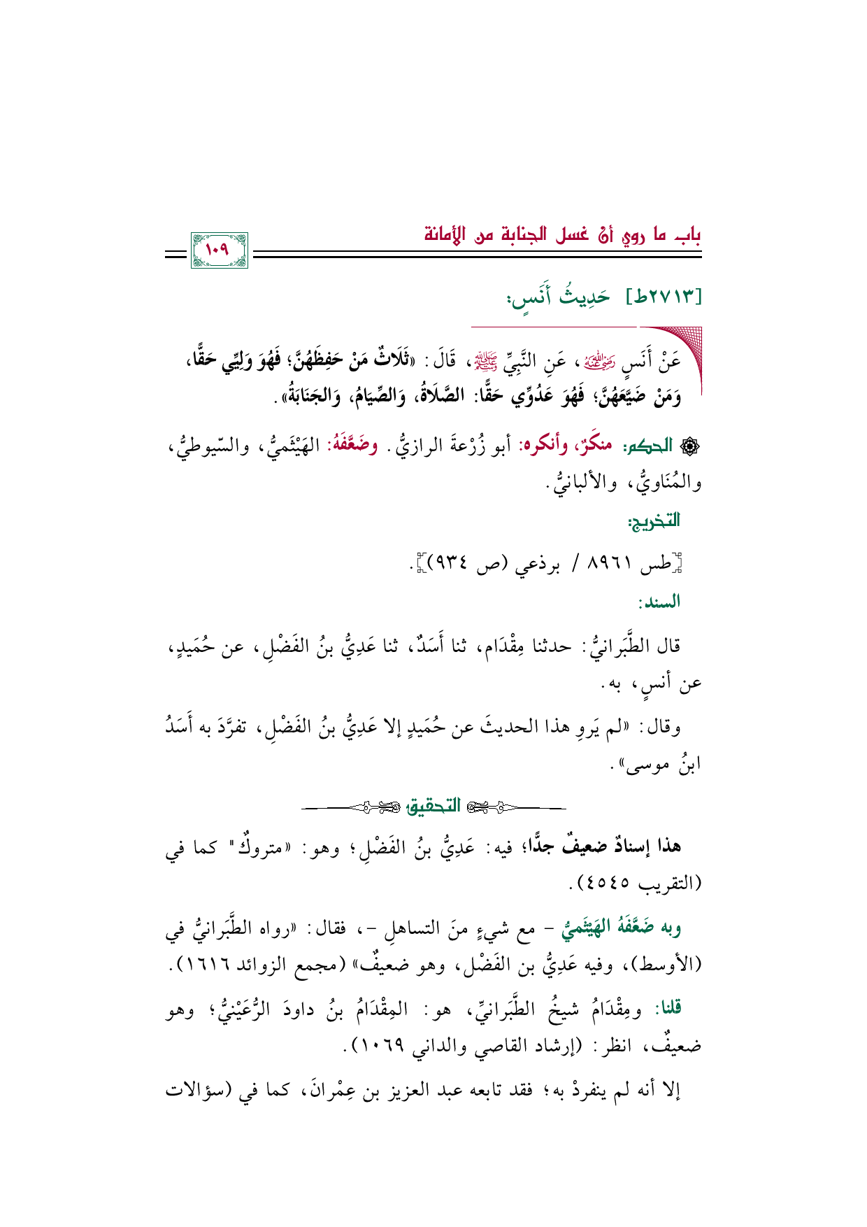 وبه ضَعَّفَهُ الهَيْثَميُّ -مع شيءٍ منَ التساهلِ-، فقال: "رواه الطَّبَرانيُّ في (الأوسط)، وفيه عَدِيُّ بن الفَضْل، وهو ضعيفٌ" (مجمع الزوائد ١٦١٦).